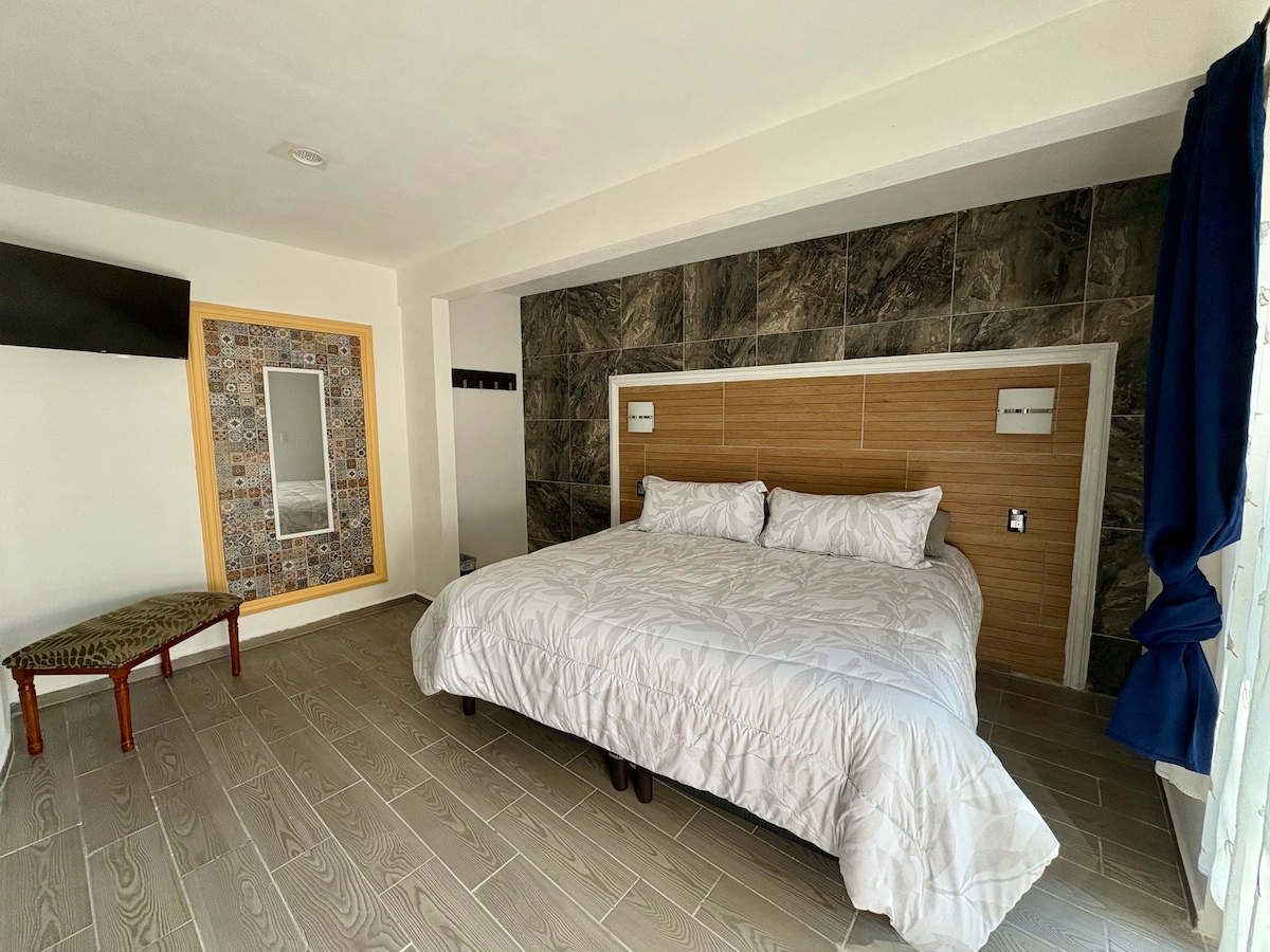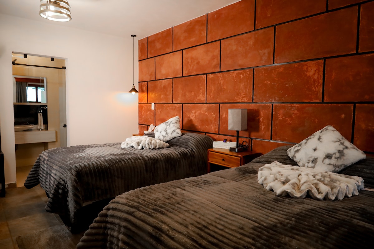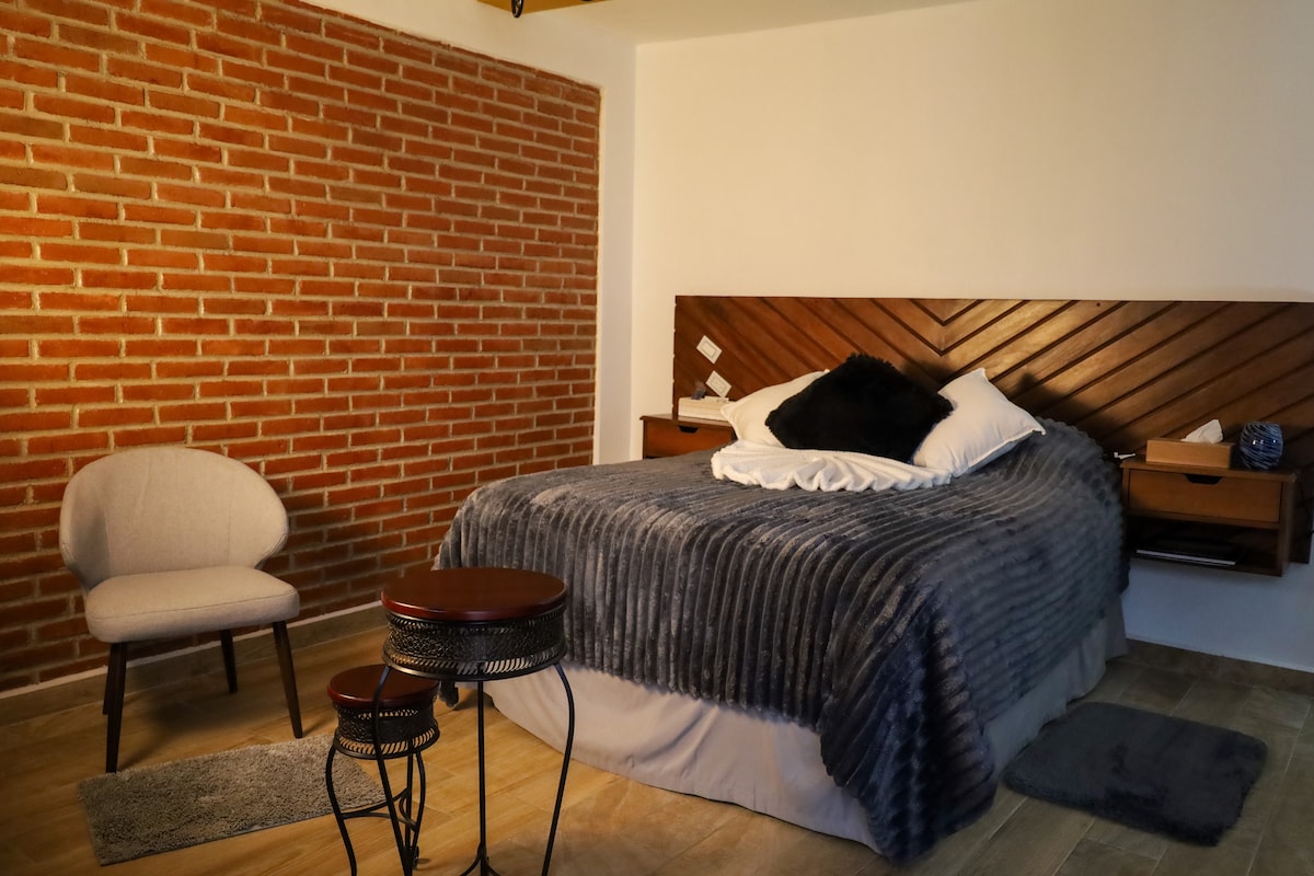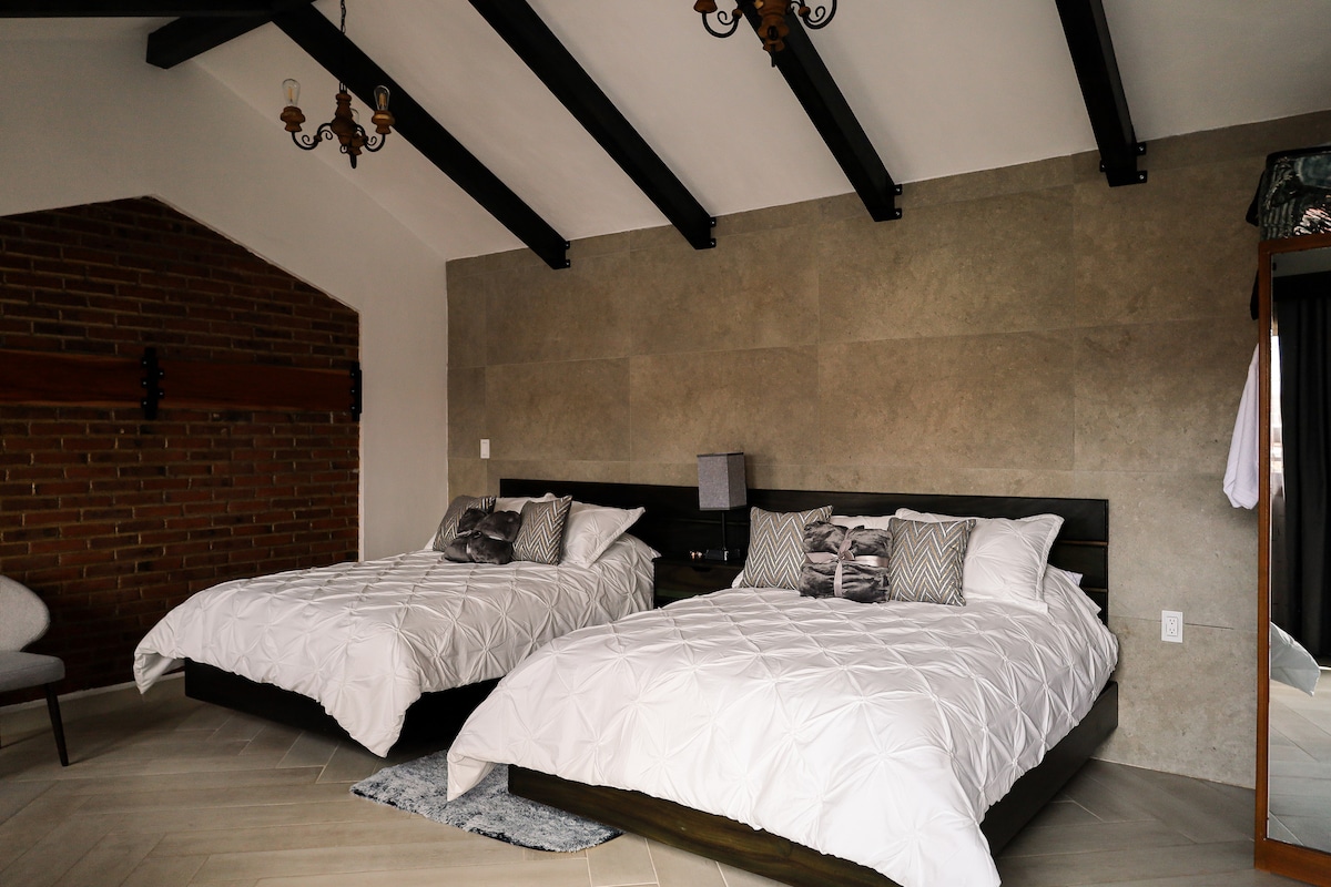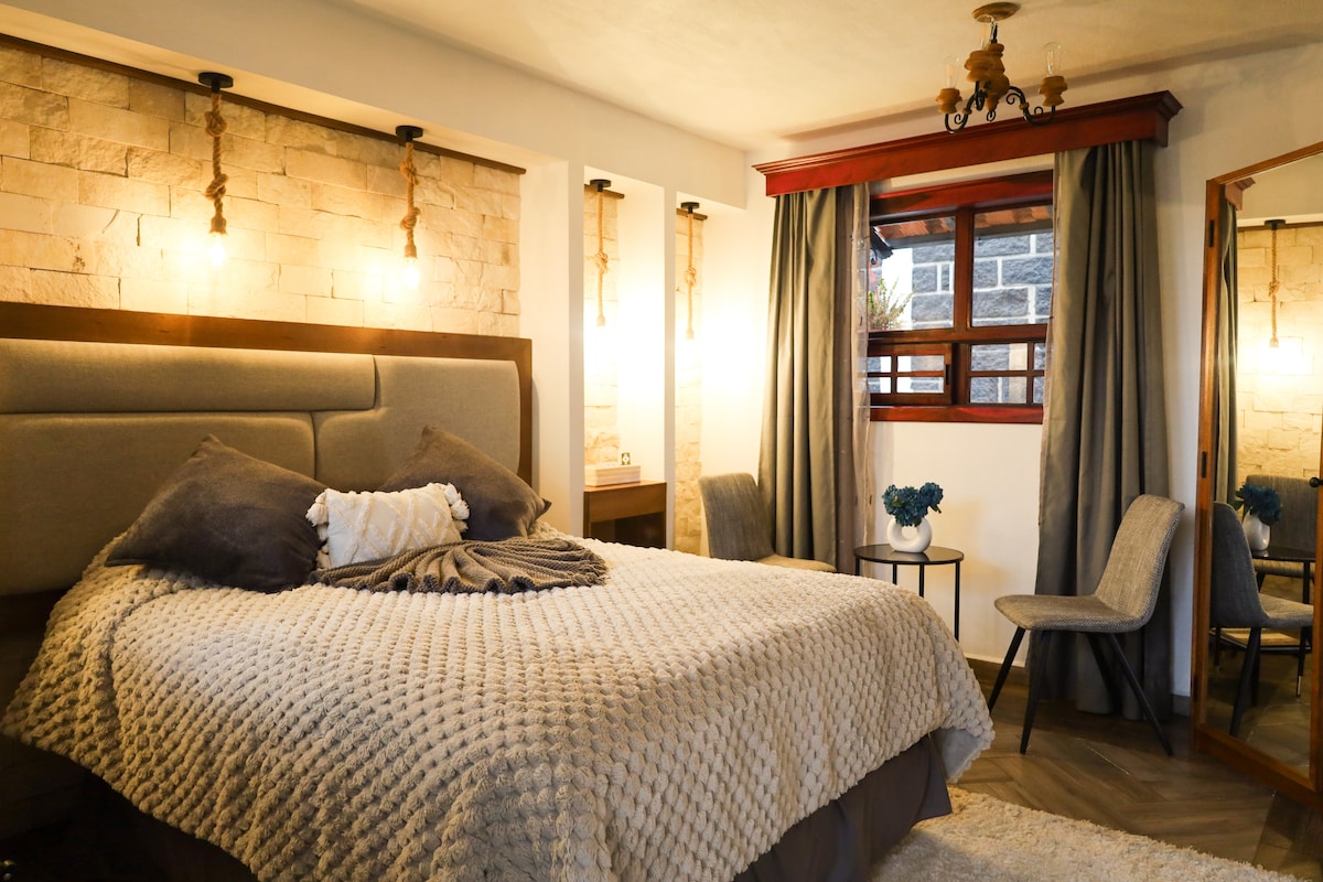 Londres ofrece un espacio sofisticado y relajante, donde la elegancia y el confort se combinan a la perfección. A través de una amplia puerta de vidrio, la habitación se abre a un balcón que permite disfrutar de vistas panorámicas, llenando el espacio de luz natural y creando una conexión directa con el exterior. La decoración moderna y los detalles acogedores hacen de Londres un refugio ideal para descansar y disfrutar de una estancia placentera en Real del Monte.