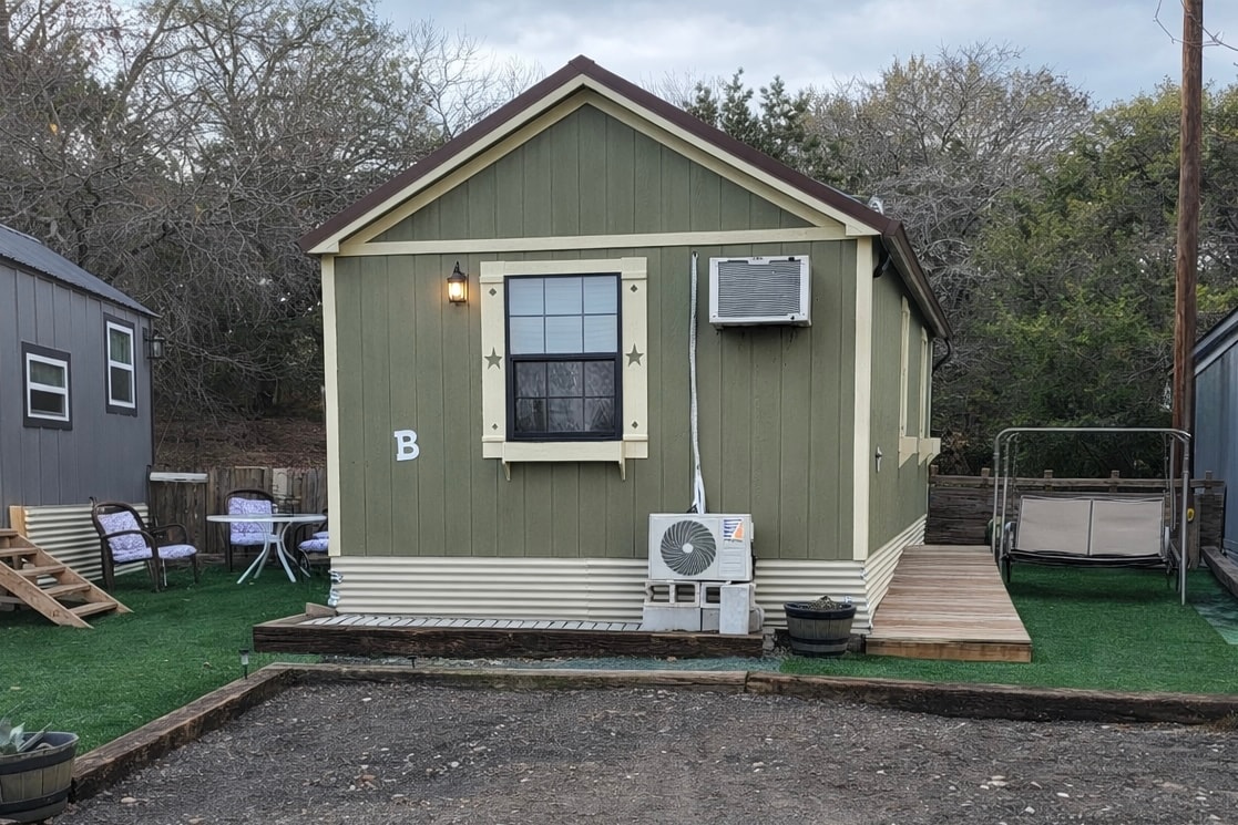 Reserve a romantic cabin for two and get away from the hustle and bustle of the city. There's a full kitchenette available, or you can visit fantastic restaurants that are just minutes away. We've even got a coffee and tea bar for your convenience. Our soaking tub and shower are big enough for two, and don't forget to visit your own private hot tub under the gazebo. Bluebonnet Cabin also has a hanging day bed on the front porch; it's perfect for snuggling with your favorite person.