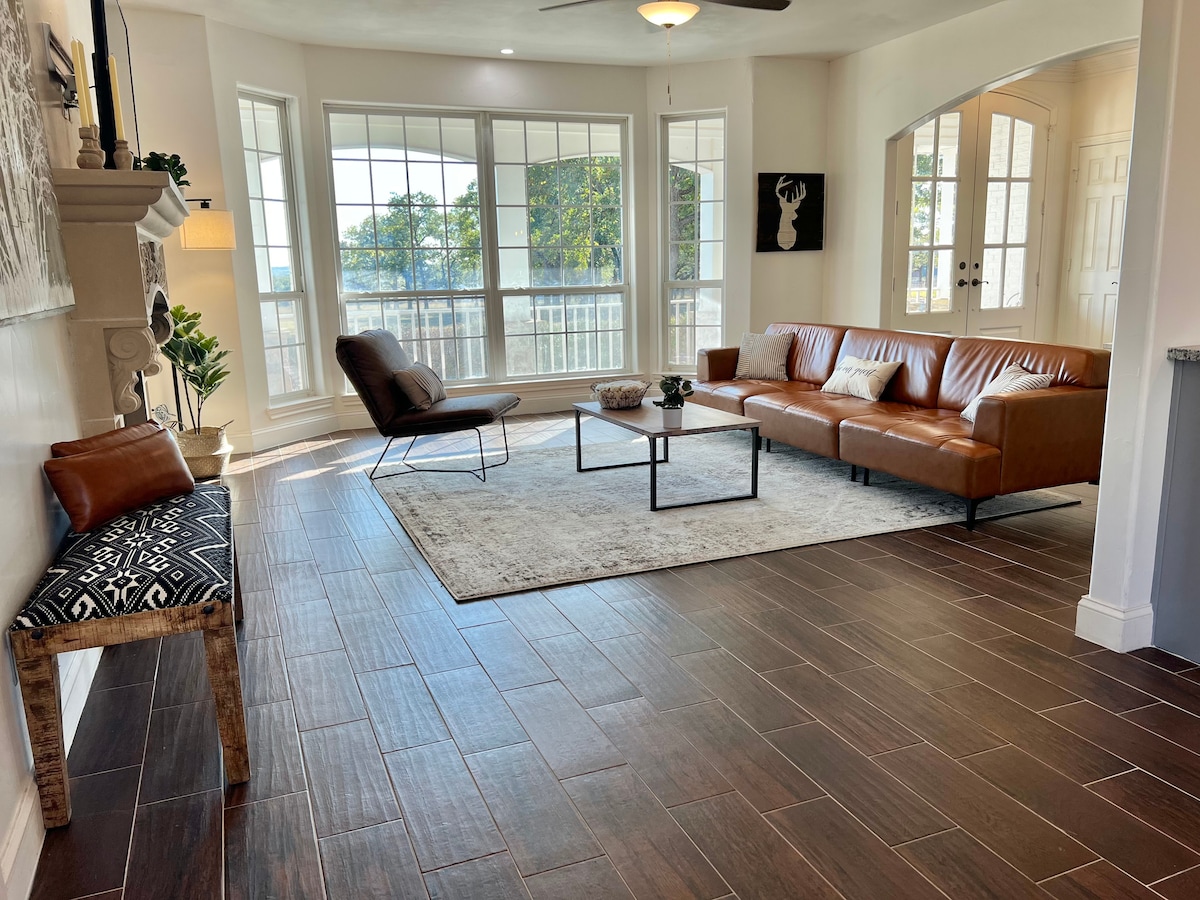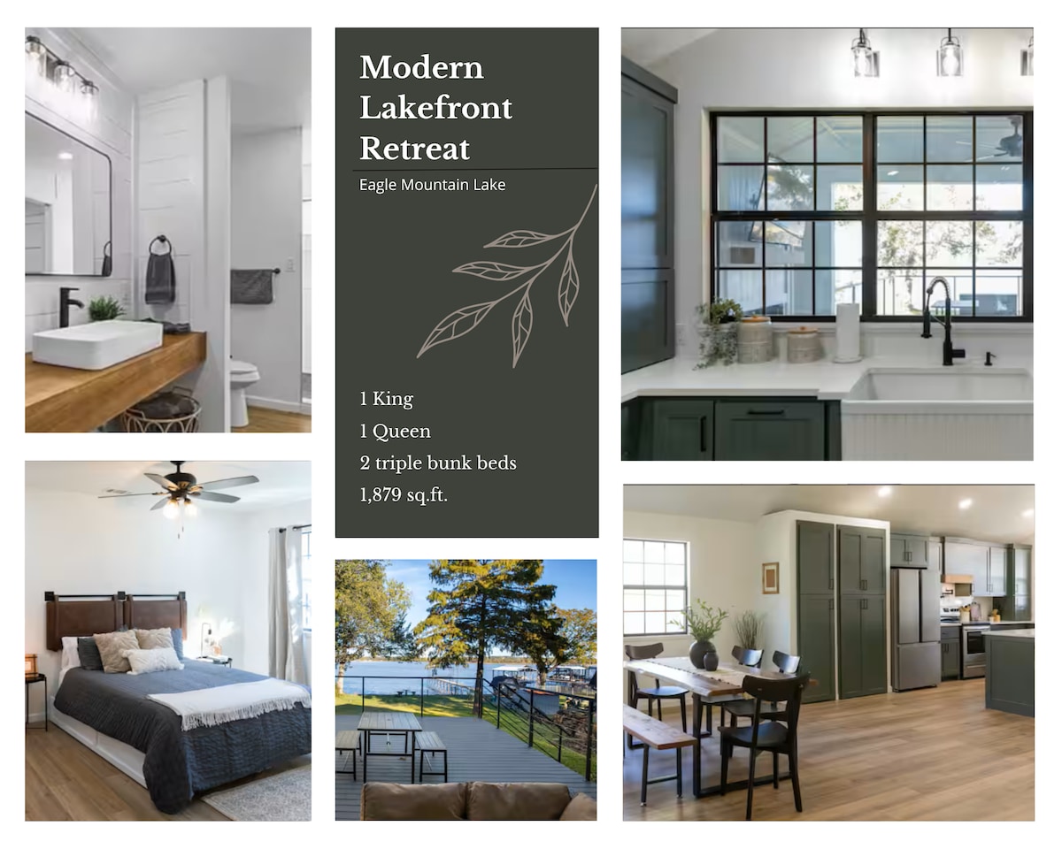 Beautiful newer-built lakefront home on Eagle Mountain Lake! Peaceful and private yet minutes from the city. Features 3 bedrooms, 2 baths, and a spacious open layout ideal for families or friends. Relax on the back deck with fireplace, TV, and stunning water views, enjoy the firepit under the stars, or paddle the lake with the canoe and life vests provided. Master suite overlooks the sunrise for a perfect start to your day. Perfect place to escape the busyness of city life!
