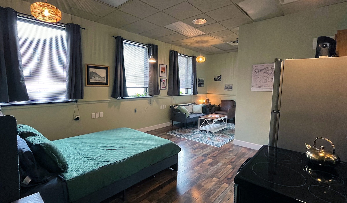 This is a 1 bed/1 ba suite with a queen bedroom. (Also see listings for #2, #3 & #4). Kitchenette with coffee bar, microwave, fridge, plates, glasses, silverware, etc, & table for 4. Bathroom with shower, towels, shampoo & soap. Living room with queen pull-out couch, sofa table, electric fireplace, & TV. Easy parking! Just off Route 119 on flat ground. Mountain views yet within walking distance of groceries, banks, a mall, & restaurants. Comfort, cleanliness, charm, & convenience!