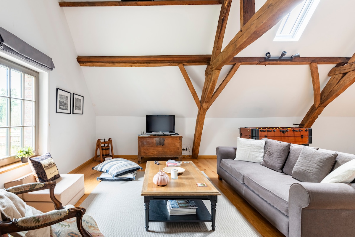 The Ciderhouse Loft is a unique space that combines modern convenience with traditional architectural features. Located on the first floor above my husband's cider brewery, with views over the castle's gardens and the countryside this light, luxurious and very spacious well planned two bedroom home can be rented by two couples, beds zip together, or a family. You are welcome to walk in the castle grounds. Off street parking. If single couple please check out the sister property, our cottage