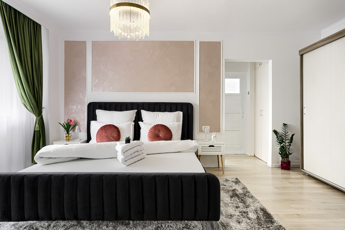 Răsfață-te cu o experiență exclusivistă într-un apartament elegant, situat în centrul orașului, la câțiva pași de cele mai importante atracții. O cadă de lux amplasată direct în zona de dormit, perfectă pentru momente de relaxare și romantism absolut, într-un decor intim și sofisticat. Facilități premium: Pat king-size cu saltea confort de hotel Cadă freestanding în cameră, cu design modern Wi-Fi de mare viteză Zonă de relaxare și ambient intim Baie separată, complet utilată Aparat de cafea.
