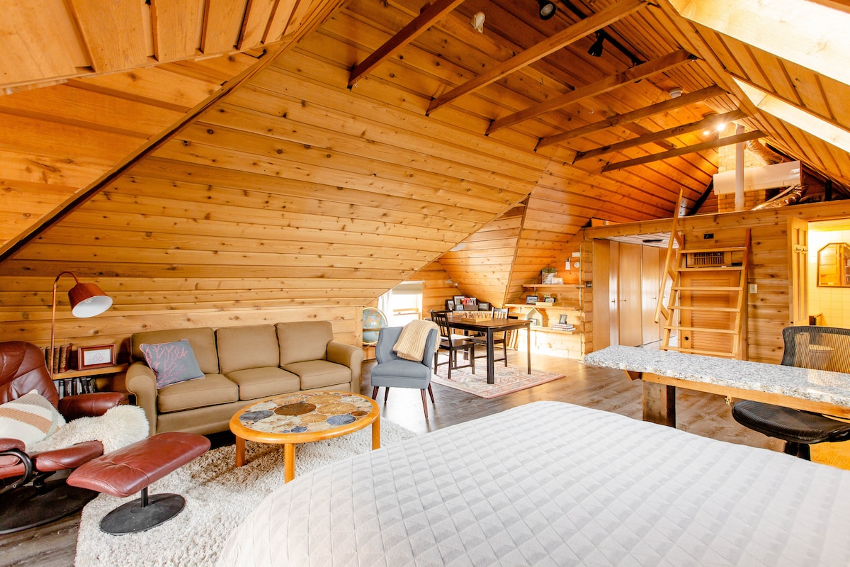 Enjoy a cedar-plank A-frame oasis in the city. This unique "Urban Cabin" features 2 queen beds, a private tree-level porch, and a cozy loft. Perfect for concert-goers & sports fans: walk to The Armory (0.6 mi) and US Bank Stadium (0.5 mi). Direct Blue Line access to MSP Airport, First Ave, and the U of M. Enjoy a full kitchen, high-speed WiFi, ample work space, and a woody, cabin-like retreat in the heart of Minneapolis. Free street parking in a vibrant, diverse neighborhood!