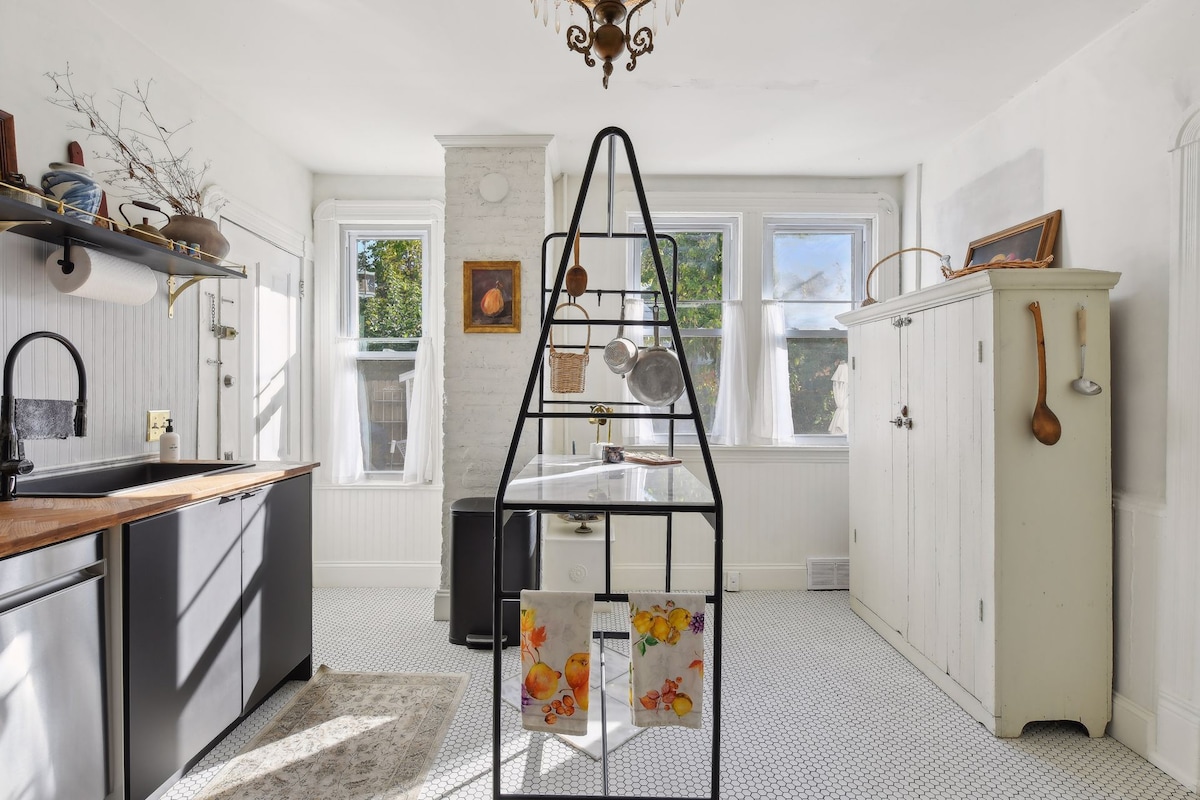 Welcome to our charming 3rd-floor studio located within a Victorian home in the heart of the NE Arts district! This cozy retreat boasts an abundance of natural light streaming in through skylights, illuminating a space adorned with beautiful plants, creating a serene and inviting ambiance. This delightful haven features a warm fireplace perfect for cozying up on chilly evenings. Please note, there is some low clearance near the head of the bed and in the bathroom/kitchen area.