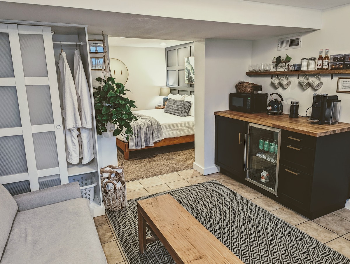 Spa quality stay in a private-entry, large master suite, minutes from airport and MOA. High end amenities you won't find in most hotels, all to yourself! Relax in a luxury 2 person hot tub & steam shower. Cuddle up in a comfy lounge area! Convenient kitchenette & work space. In the heart of peaceful SE Mnpls, we are blocks away from Lake Nokomis beaches, trails, rentals, unique dining & more. 15 minutes to downtown. Come pamper yourself while you discover Minneapolis!