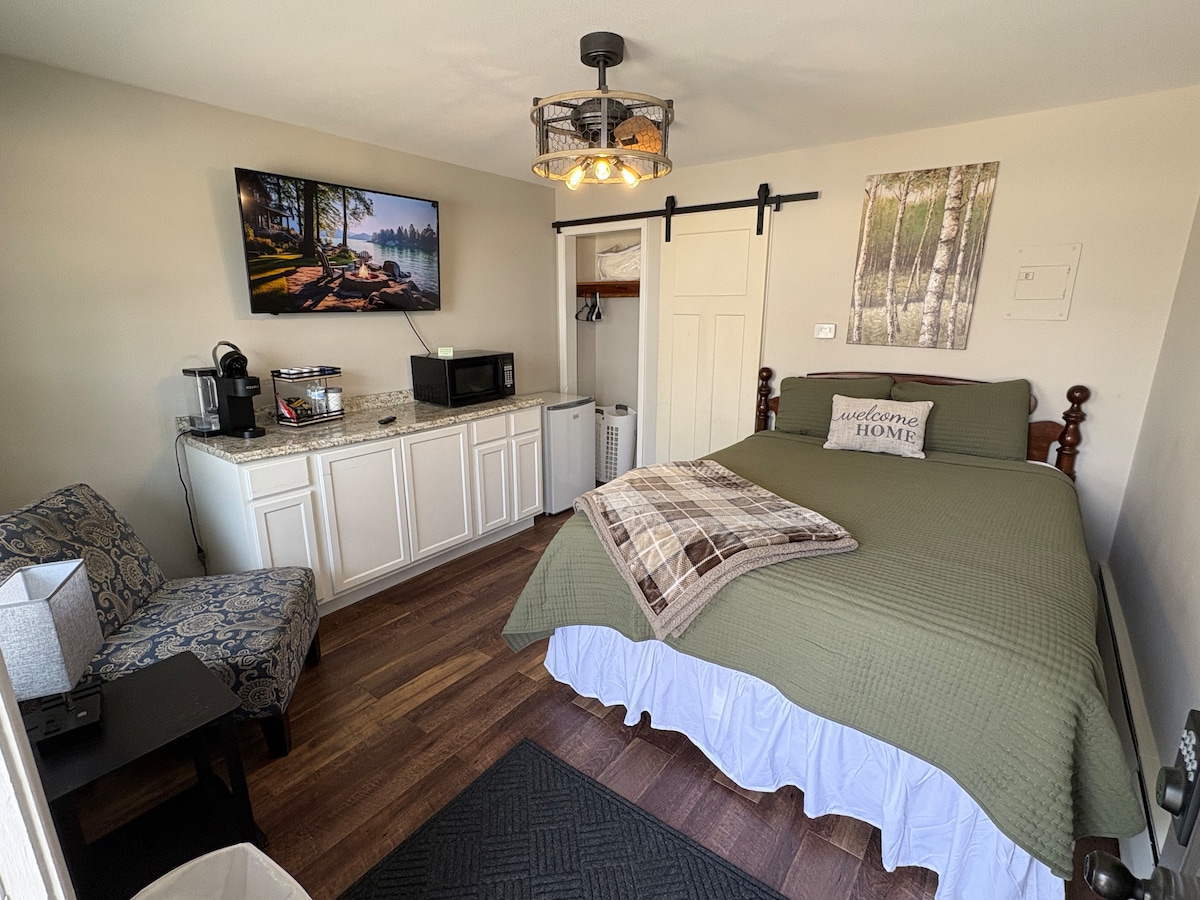 Welcome to Lodging at Lake Aire in the charming community of Waseca Mn. This is an updated room in our extended stay Motel. The 3 acre property and views of clear lake are sure to please. This studio has a refrigerator, microwave, toaster and Keurig style coffee pot. This unit features a new queen sized plush soft bed with all new pillows and linens. The private bathroom has a stand up tile shower, soaps & all new towels. There is also a semi private concrete patio overlooking the 3 acre yard.