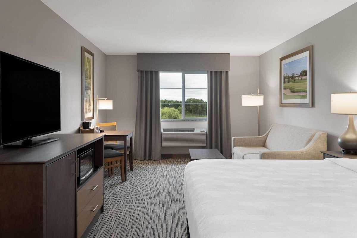 Dual queen suite with access to pool, hot tub, sauna, gym, lounges, and outdoor lounge space. Just minutes from Mall of America, MSP Airport, and the light rail to downtown. Features two plush queen beds, work desk, and kitchenette with mini-fridge, microwave, and coffee maker. Enjoy free airport shuttle, on-site dining, and all the amenities for a relaxing and convenient stay.