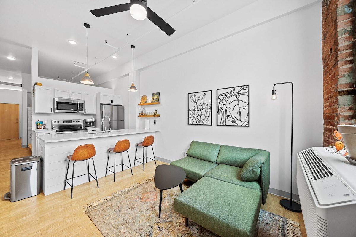Enger Lofts Hotel is your adventure-town getaway in the heart of the Craft District of Duluth, Minnesota. Remodeled in 2020, this 1800s era warehouse features a modern kitchen, soaring ceilings, & large windows inside an airy, cozy studio.