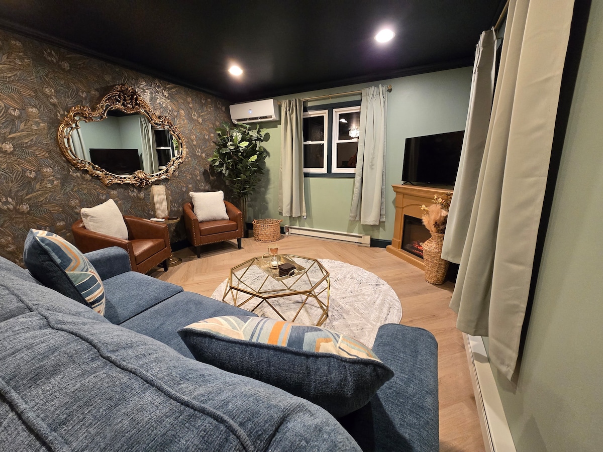 Step into a true urban retreat that has been fully renovated, offering 1,000 sq. feet of inspiring space. The modern European kitchen awaits your culinary adventures, while the serene living room, adorned with a large fireplace and 75" TV, invites relaxation. Flow seamlessly into the airy bedroom, featuring a king-size bed and a dedicated workspace. The bathroom, with its floor-to-ceiling tiles and luxurious rain shower, exudes elegance. For comfort, this unit, fully air-conditioned and heated.