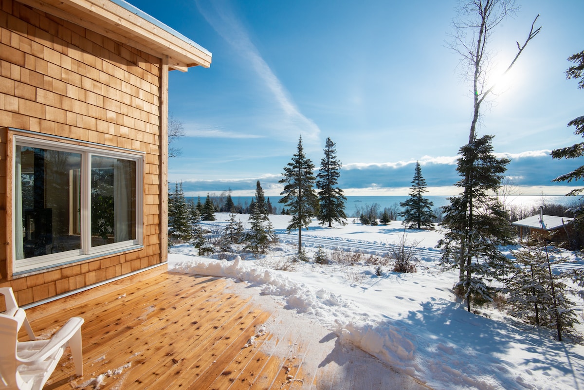 Only 4 miles from Grand Marais, Tranquilo is a part of Agua Norte: “The Coolest Airbnb in MN” by Condé Nast. Built in 2022, it has large windows to enjoy the Lake Superior view, a fireplace, organic mattress and linens, plush rugs and chunky throws. Grab your coffee and walk down to the pebble beach across the road, or hang out on the large cedar deck and watch the waves crash on Five Mile Rock, take a sauna or hike our trail. Follow us @aguanortemn