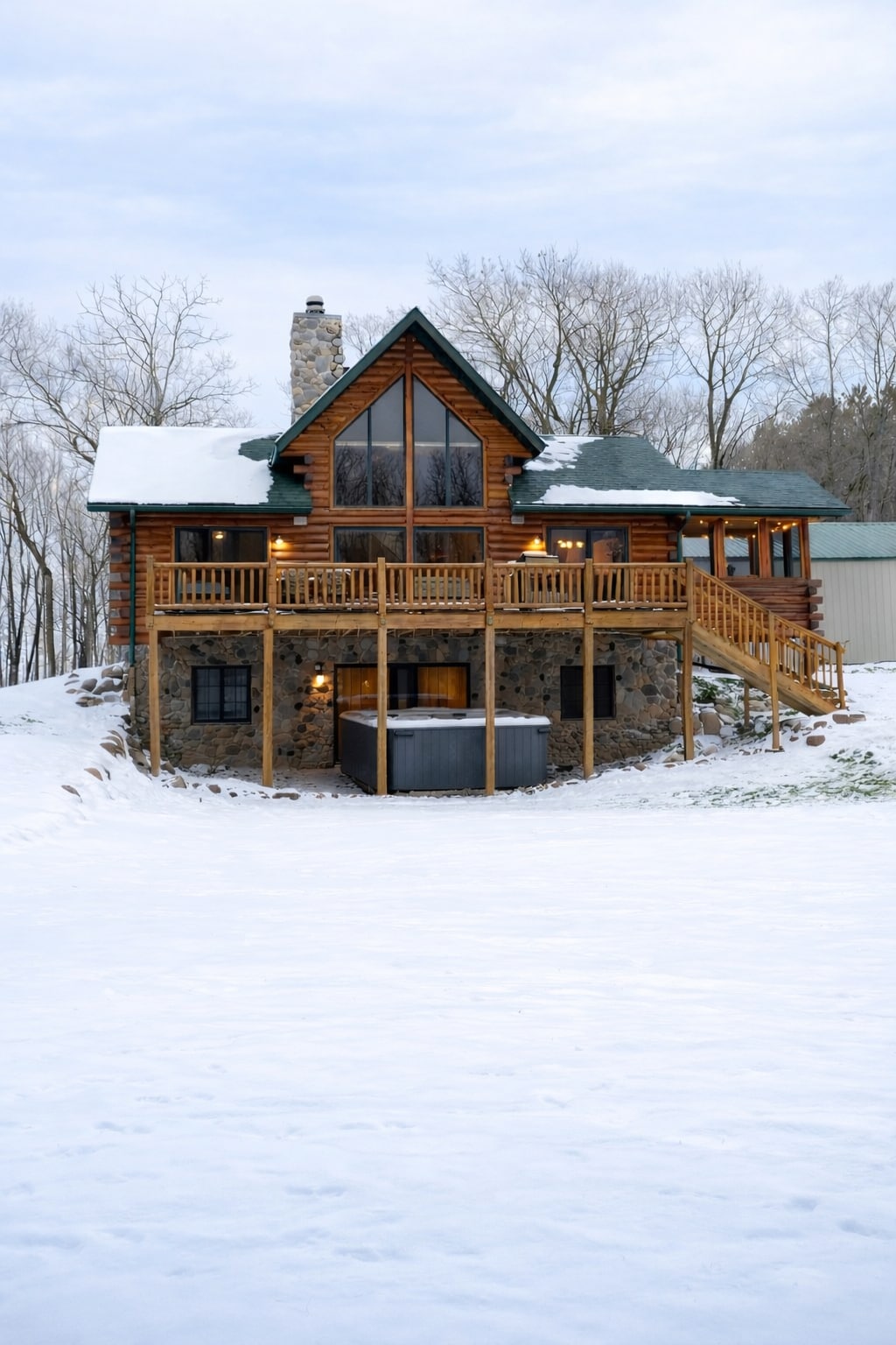 Relax with your family at the lake, pull your boat up to the dock! A true log home, recently built with great amenities—heated game room and outdoor pizza oven for cozy nights! With 10 beds and 16 sleeping spots, this property can accommodate your entire family gathering. Enjoy the hot tub, jacuzzi tub in the main bath, or try out the large shower with multiple jets and rain shower. Movie theatre with 82” smart TV and electric reclining seats. Just over an hour from the twin cities!