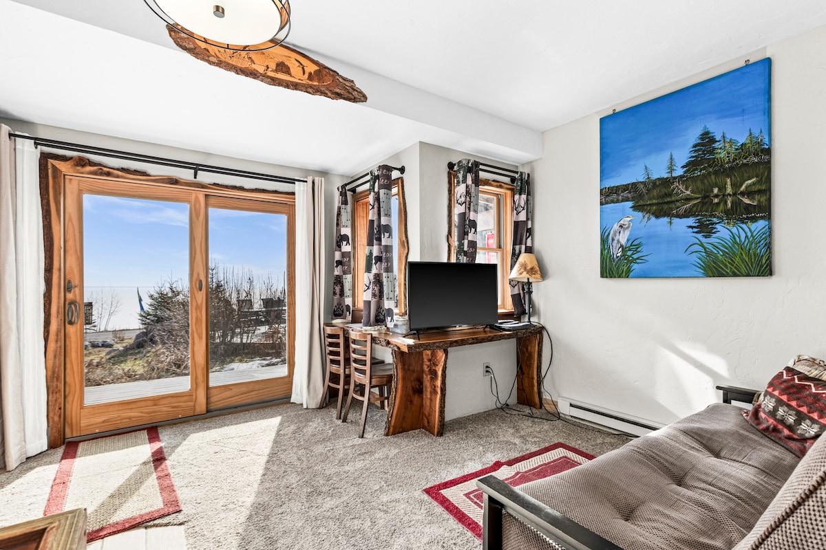 Unwind in The Okabena Suite, a cozy main-level retreat with Lake Superior views and immediate deck access at The Inn on Gitche Gumee. This handcrafted queen suite features bespoke black walnut furnishings, hand-stitched quilts, DirecTV, WiFi, and a convenient kitchenette. Sip locally roasted coffee, enjoy peaceful waterfront surroundings, and relax in a warm, artistic space designed for couples or solo travelers seeking comfort and North Shore charm.