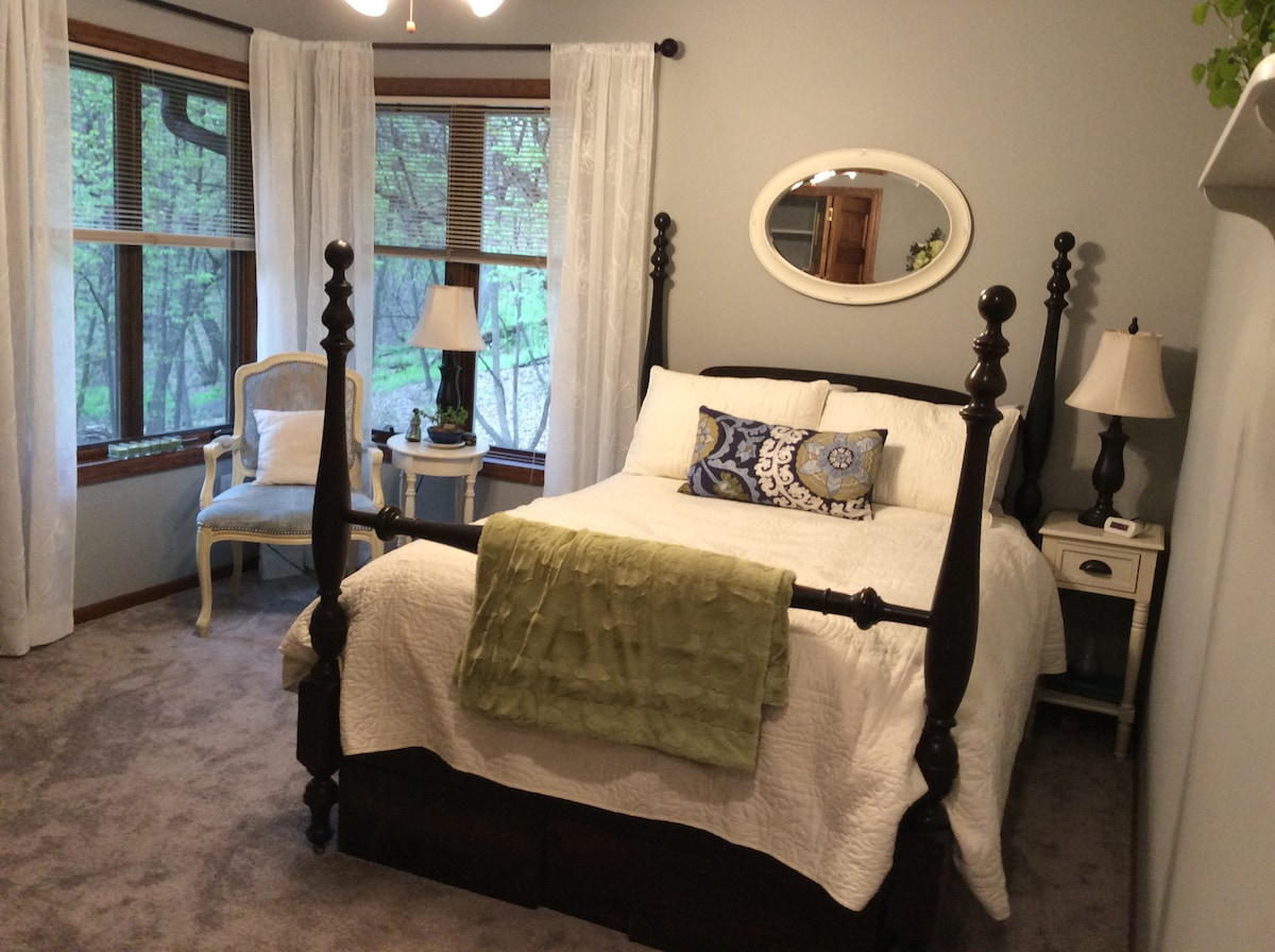 Come stay in our newly remodeled private bedroom and bath. Enjoy the views from your windows of our 2 acre wooded property with a creek running through the backyard. Relaxing, stylish, and refreshing, may you enjoy this retreat as much as we do!