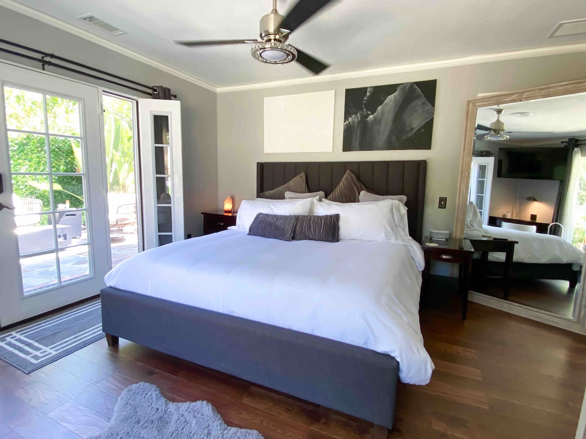 Perched above a canyon with spectacular panoramic mountain views, this private guest house is a secluded retreat in one of San Diego’s most eclectic and desirable neighborhoods less than 6 miles from the Downtown San Diego airport. Enjoy a fully equipped kitchen, luxe king size bed and dual sliding glass doors that open to an expansive deck with patio seating, private hot tub and BBQ area.