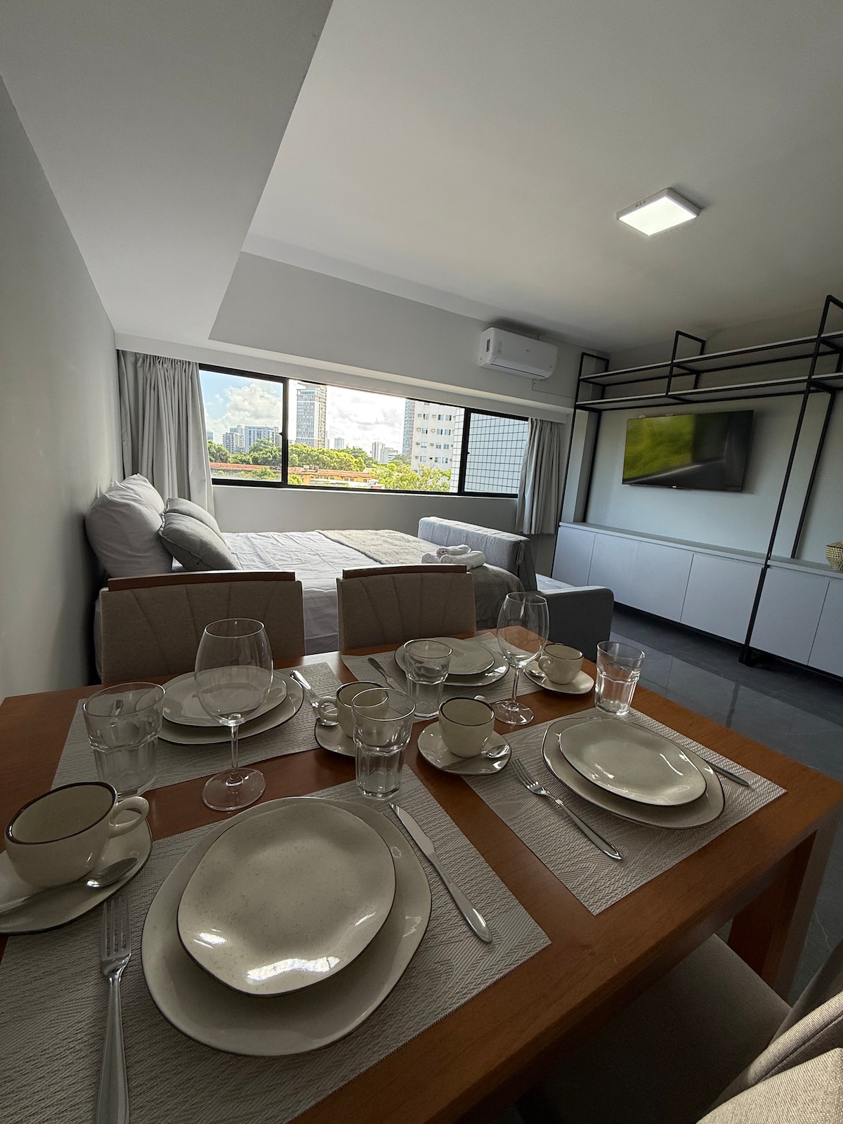 Ideal para quem vem a Recife a trabalho, consultas, concurso e lazer. Localizado no coração da cidade, o Estúdio Max Derby 1607 oferece conforto, praticidade e uma estrutura completa com piscina no rooftop. A poucos metros da Praça do Derby, hospitais, Consulado Americano e Shopping RioMar, o imóvel está em uma das áreas mais estratégicas de Recife. O apartamento: - Cama de casal + 2 colchões - Cozinha com fogão, micro-ondas, frigobar, airfry, sanduicheira, cafeteira e pipoqueira - TV 55"