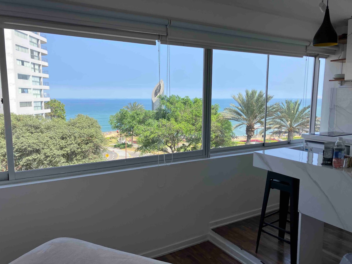 Hermoso Loft con vista al Océano Pacífico frente a Larcomar. La mejor ubicación para explorar Miraflores y Barranco, los lugares y restaurantes más visitados. Pasear por el malecón que une tres distritos, los más bonitos y seguros. Será un placer despertar en la mañana con la vista de la Bahía de Lima, del lindo malecón y del parque. Simplemente espectacular. Disfrutaras de preparar y tomar tu café mirando el mar. Regresar al bello Loft luego de recorrer la ciudad es un placer total.