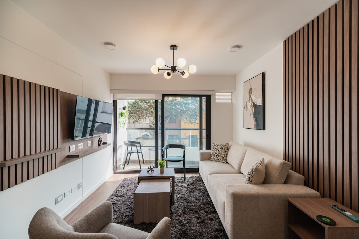 Very practical apartment. Bedrooms furniture is costume made by Kuni Peru with a beautiful wooden plating, very creative and unique. The night stand lamps have usb ports and have perfect lighting for night reading. The living room and bedrooms lead to balconies with views of Miraflores, La Paz St. and Diez Canseco St. and have floor to ceiling canceling sound sliding screens. The couch is American made and is extremely comfortable. 24 hour convenience store literally in front of the building.