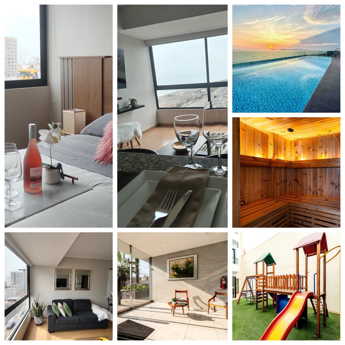 THE BEST LOCATION, ELEGANT DECORATION Barranco/ Miraflores, a few steps from San Isidro, Chorrillos, Costa Verde Beaches. 1 bedroom -Queen bed 1 full bathroom Living room - double sofa bed 2 flat screen TVs -Bedroom and living room 3 burner stove -3 burners Equipped open kitchen Microwave oven Refrigerator Washer-dryer Electric water heater Air conditioner Balcony Outside parking - Common areas: Swimming pool Jacuzzi Gym Grill Lounge Game Room Bar room, giant TV Laundry