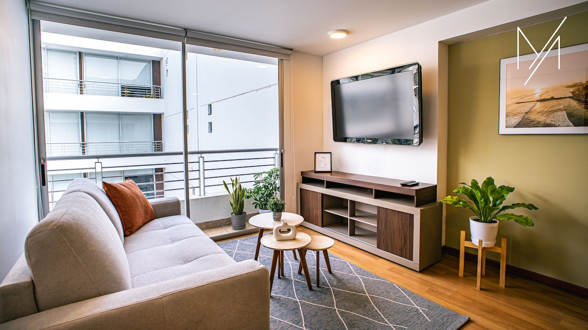 Refined boutique loft in central Miraflores with a king suite, 1.5 baths, and a balcony lined with greenery. Soft ambient lighting and clean architectural design create a calm, elegant atmosphere. Enjoy a gourmet kitchen, Smart TVs, fast WiFi, washer/dryer, weekly cleaning for long stays, and two underground parking spaces. Steps from Kennedy Park and the ocean—a serene, design-forward stay.