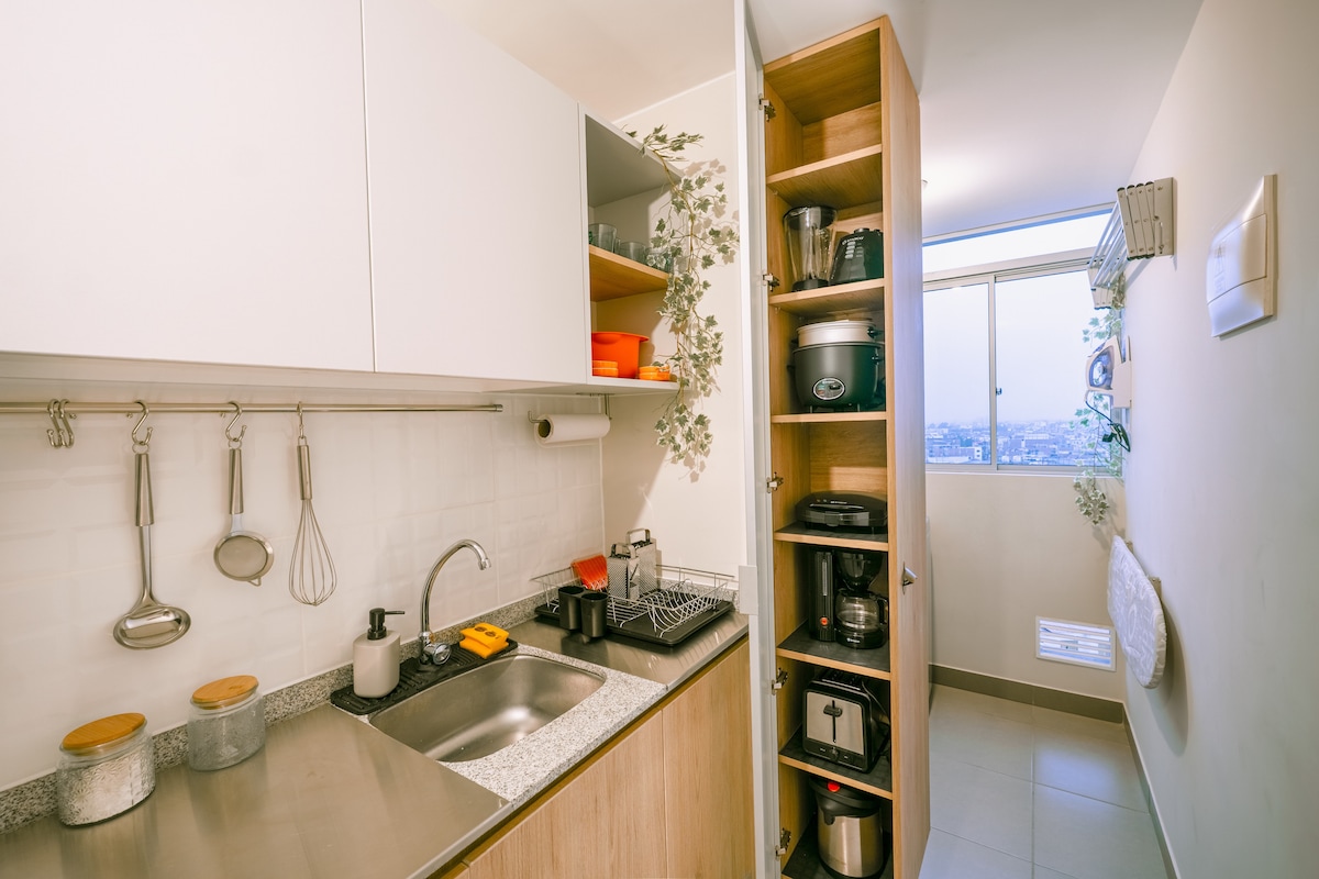 Moderno loft de estreno, muy bien ubicado y con increíble vista panorámica desde el piso 35. Fácil acceso a avenidas principales, centros comerciales, museo, tren, centro financiero, clínicas, gimnasios, parques. Cuenta con lavandería, baño principal , kitchenette, cocina equipada, walking closet, agua caliente, TV y WIFI. Áreas comunes: mirador de la ciudad, Rooftop, Co-working. Cerca a distritos turísticos como Miraflores, Barranco y Centro Histórico de Lima.