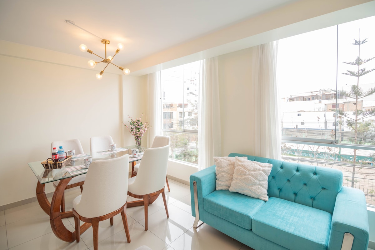 Brand-new, spacious and fully equipped apartment just 350 m from the Miraflores oceanfront. Perfect for relaxing, working, or enjoying a home cinema experience with its HD projector and automatic screen. Features 2 bedrooms (master with queen bed and 4K Smart TV), a cozy living room with queen sofa bed, and a balcony with side ocean view. 100MB high-speed WiFi. We have parking. Top location near Larcomar, cafes, museums and restaurants.