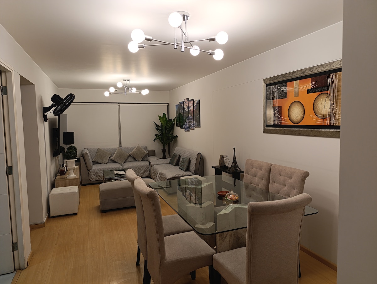 Apartamento de 120m2, con cerradura inteligente de 4 habitaciones(6camas+4sofascamas+4baños) con capacidad hasta 11 personas, ubicado en Miraflores a 3 cuadras del Parque Kennedy, Centro Comercial Larcomar,Restaurantes, Discotecas, Bares, Playas. Sala, Comedor, Lavadora-Secadora y Cocina Equipada, Agua Caliente, Calefacción Portatil, Toallas y Artículos de Aseo personal. Cochera y vigilancia 24horas. Piscina y Parrilla Solo con previa reservacion. Aviso de Construcción Aledaña (8am a 5pm)