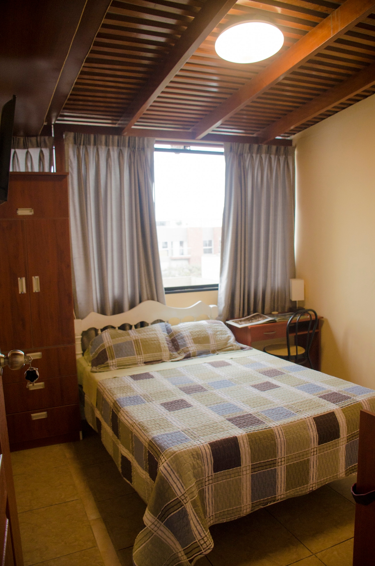 Es una habitación privada amoblada con baño interior incluido con servicio wifi y tv por cable. Con una mesa escritorio portátil para laptop con silla. 2 camas vestidas y con almohadas .Una ventana con vista a un parque. Cómoda e ideal para 2 personas o si prefiere 1 y se le acondiciona. Familia que sabe qué el indicador servicio es fundamental en la relación mutua. Acceso independiente por escalera de caracol.