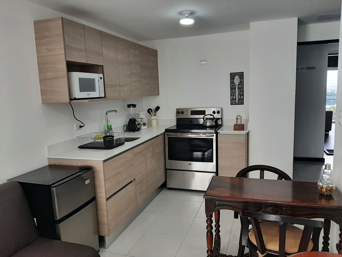 Enjoy a spectacular view of the volcanoes from your private balcony in this cozy, modern studio. It’s fully equipped with high-quality amenities, from a comfy queen-size bed to a handy sofa bed for extra guests. With a fully equipped kitchen, and black out curtains, you’ll have everything you need for a relaxed and fun stay. It includes one parking space, on-site gym and access to the building’s convenience store. Just 8 minutes from the airport is the perfect place for you and your beloved