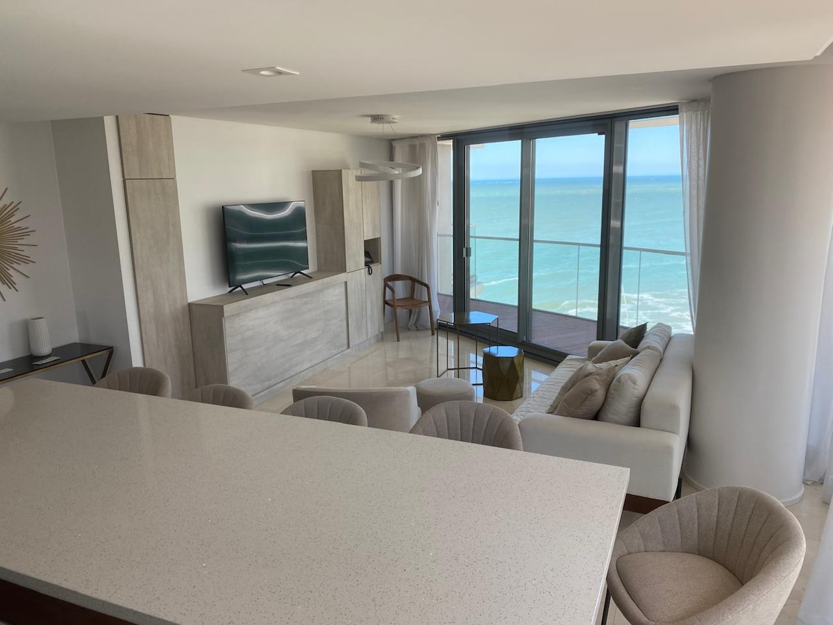 Departamento exclusivo en Torre, Frente al mar en el complejo residencial Maral Explanada, obra del arq. Cesar Pelli. 3 Torres de planos curvos con balcones aterrazados en voladizo, emplazados en una manzana entera, en una atmósfera moderna y minimalista. Lugar Unico. sobre la av. Peralta Ramos, Playa chica, zona emblemática de la ciudad. Departamento de 83 metros cuadrados, con Dormitorio en suite con baño completo c/hidromasaje, toilette, cocina integrada con barra, cochera fija y amenities