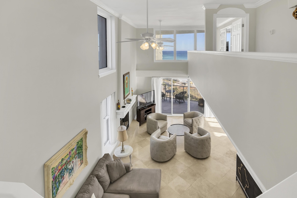8th fl. stylish open studio w/stunning VIEW, beachfront in Sandestin Resort between Destin & 30A. 🛺 Golf cart with 3+ nts. NEW Pool & Hot Tub. West Elm furniture & King size bed w/ocean view. Sleek Kitchen w/dishwasher & Keurig. WiFi, 55” smart TV. Washer/dryer. Huge balcony to gaze @ the sea. Enjoy the beach, dining, shopping, trails, golf & entertainment all without leaving the resort. Tram pass & Gym. Perfect for honeymoon, baby moon, girls trip, solo travel or lil family vacay *no animals