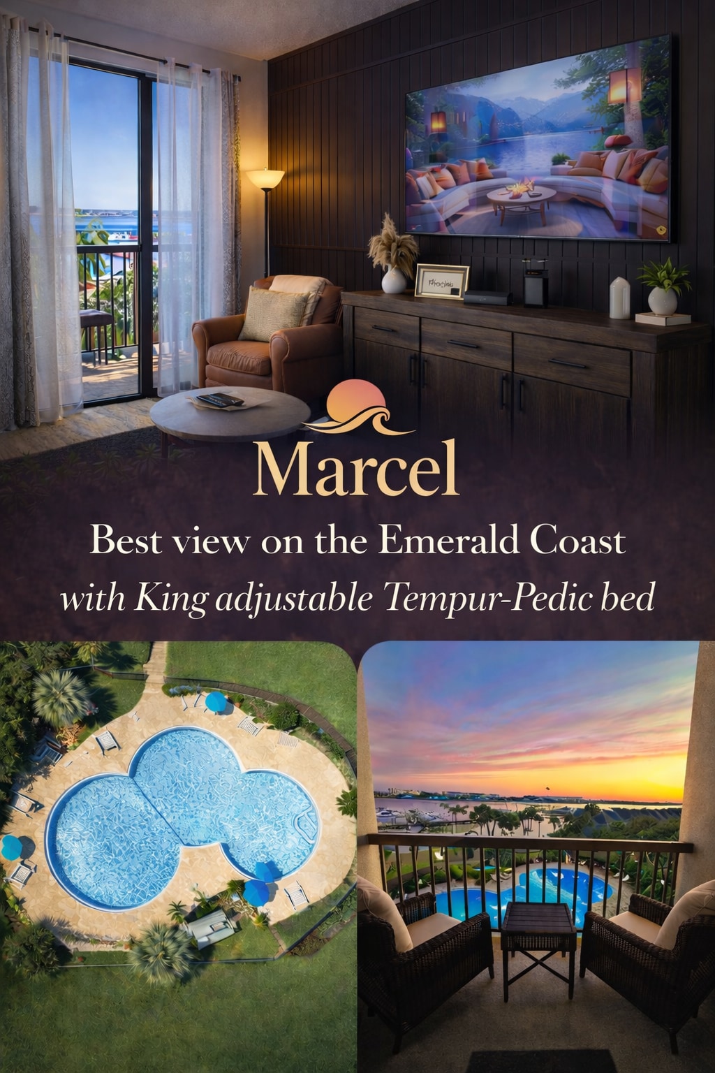 8th fl. stylish open studio w/stunning VIEW, beachfront in Sandestin Resort between Destin & 30A. 🛺 Golf cart with 3+ nts. NEW Pool & Hot Tub. West Elm furniture & King size bed w/ocean view. Sleek Kitchen w/dishwasher & Keurig. WiFi, 55” smart TV. Washer/dryer. Huge balcony to gaze @ the sea. Enjoy the beach, dining, shopping, trails, golf & entertainment all without leaving the resort. Tram pass & Gym. Perfect for honeymoon, baby moon, girls trip, solo travel or lil family vacay *no animals