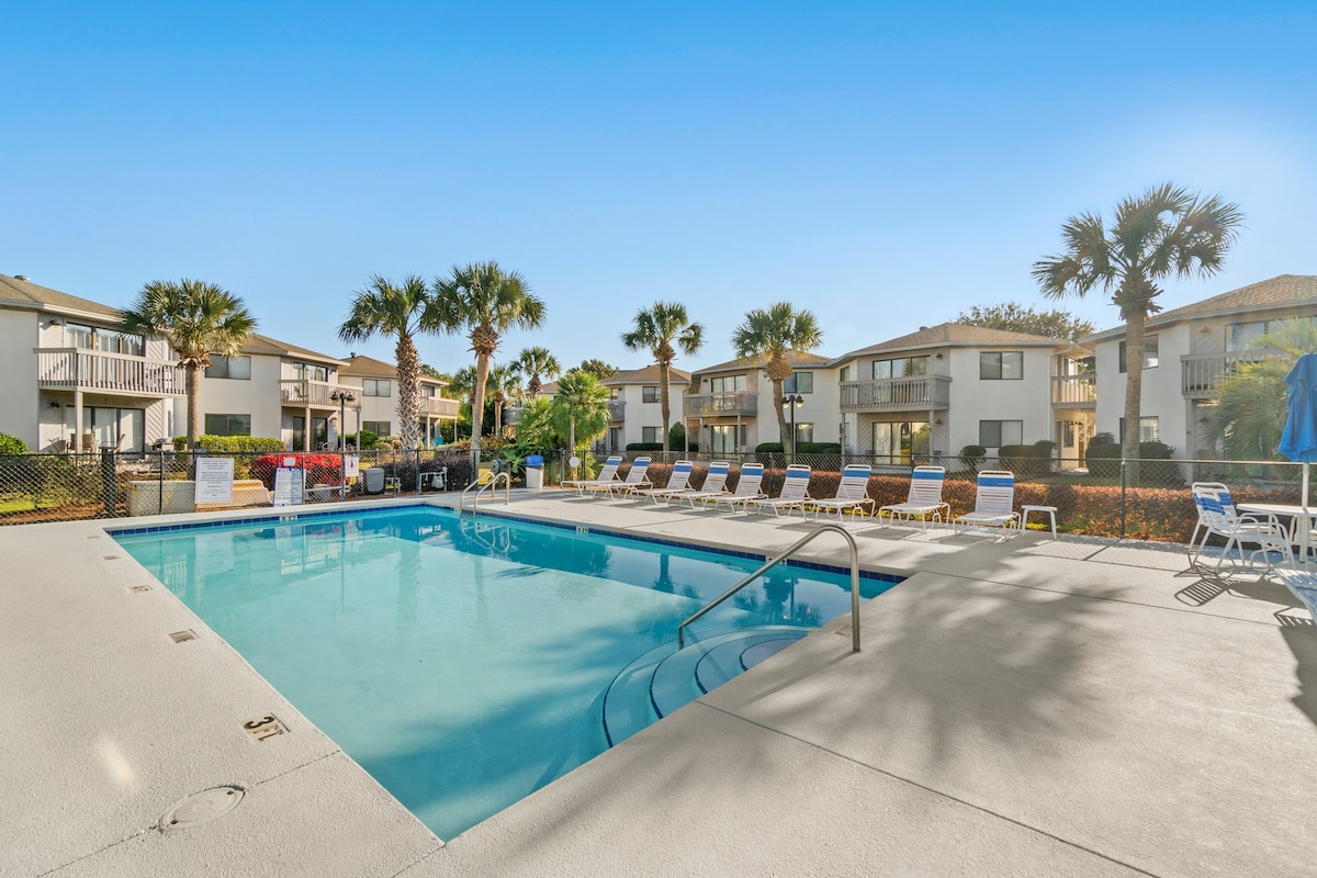 Less than a five-minute walk to a private beach in Destin, Florida! This Gulf paradise ground floor condo is DOG FRIENDLY. Located in the Chateau La Mer resort complex guests have access to a private parking space, heated pool, tennis courts, and private beach access. There is not an ocean view with this condo. This condo is 850 sq ft. It works well for a couple with up to two children. We do not recommend more than three adults staying at one time.