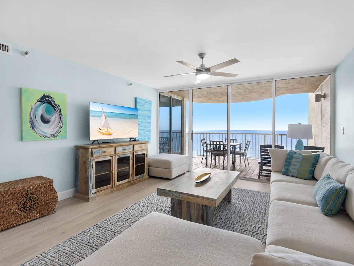 Elegant 1BR/2BA condo at Majestic Sun with breathtaking Gulf views from the spacious 10th floor balcony. Stylishly furnished with a coastal touch, it features a king bed, ensuite bath, hallway bunks with their own TV featuring Netflix, and a queen sleeper sofa. Enjoy a full kitchen, high-speed Wi-Fi, and TVs in every room. Located in the A building near covered parking with easy access. Guests return year after year for the ocean and beach views, comfort, and unforgettable beach experience.