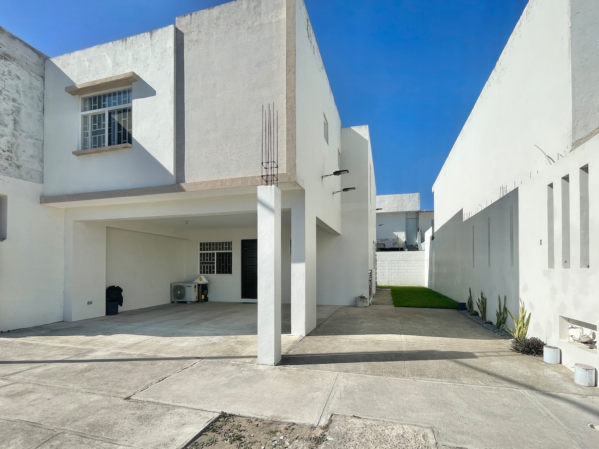 Quédate en esta CASA COMPLETA a tan solo 5 minutos en carro de la playa , que incluye 2 recamaras climatizadas con closet, un baño moderno y completo con agua caliente ♨️ en la sala una Tvde 65pulg para ver y escuchar tus videos de música o pelis, incluye una cocina amplia y iluminada con café y demás elementos que cuenta con barra desayunadora, una cochera en iinterior para 2 vehículos protegido, la terraza con asador para esas tardes en compañía