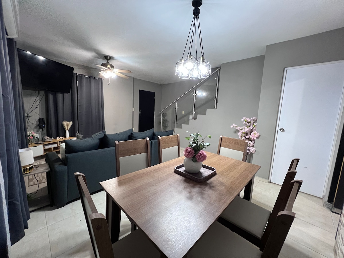 🏡 Acogedora casa en fraccionamiento seguro 🔐 🛏️ 2 recámaras con minisplit, abanico de cielo y 📺 Smart TV (Netflix) — Recámara 1; 1 cama matrimonial 🛌 Recamara 2.- 2 individuales 🛏️. 🚿 1.5 baños | 🛋️ Sala con Smart tv| 🍽️ Cocina equipada con refri, microondas, horno eléctrico, cafetera y utensilios. 🧺 Cuarto de lavado con lavadora y secadora. 🚗 Estacionamiento para 1 auto y entrada autónoma 🔑. Ideal para familias o estancias de trabajo.