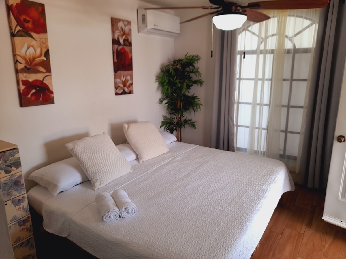 "Nuestro departamento esta a 5 minutos en carro de playa Miramar. Cuenta con cocina equipada con estufa, horno, licuadora, cafetera, utensilios básicos de cocina; Un baño completo con agua caliente. La habitación principal cuenta con MiniSplit, 1 camas matrimonial y una Queen sice y closet amplio. Otra habitación con una cama Quin Size (sin aire acondicionado) . Sala de estar con una pantalla de 40 pulgadas, WIFI, y tv por cable. terraza con asador, mesas y sillas.