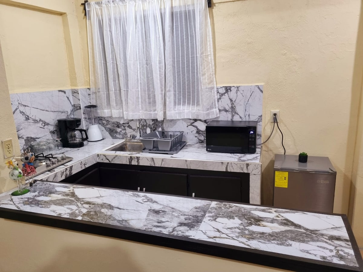 Cómodo mini departamento, con una habitación muy amplia y todo lo necesario para una estancia agradable y placentera, cuenta con una cama matrimonial, un sofá cama, cocina equipada, un baño amplio, aire acondicionado, smart tv con netflix, Internet y una excelente ubicación, muy cercana a las partes más visitadas de nuestra ciudad.