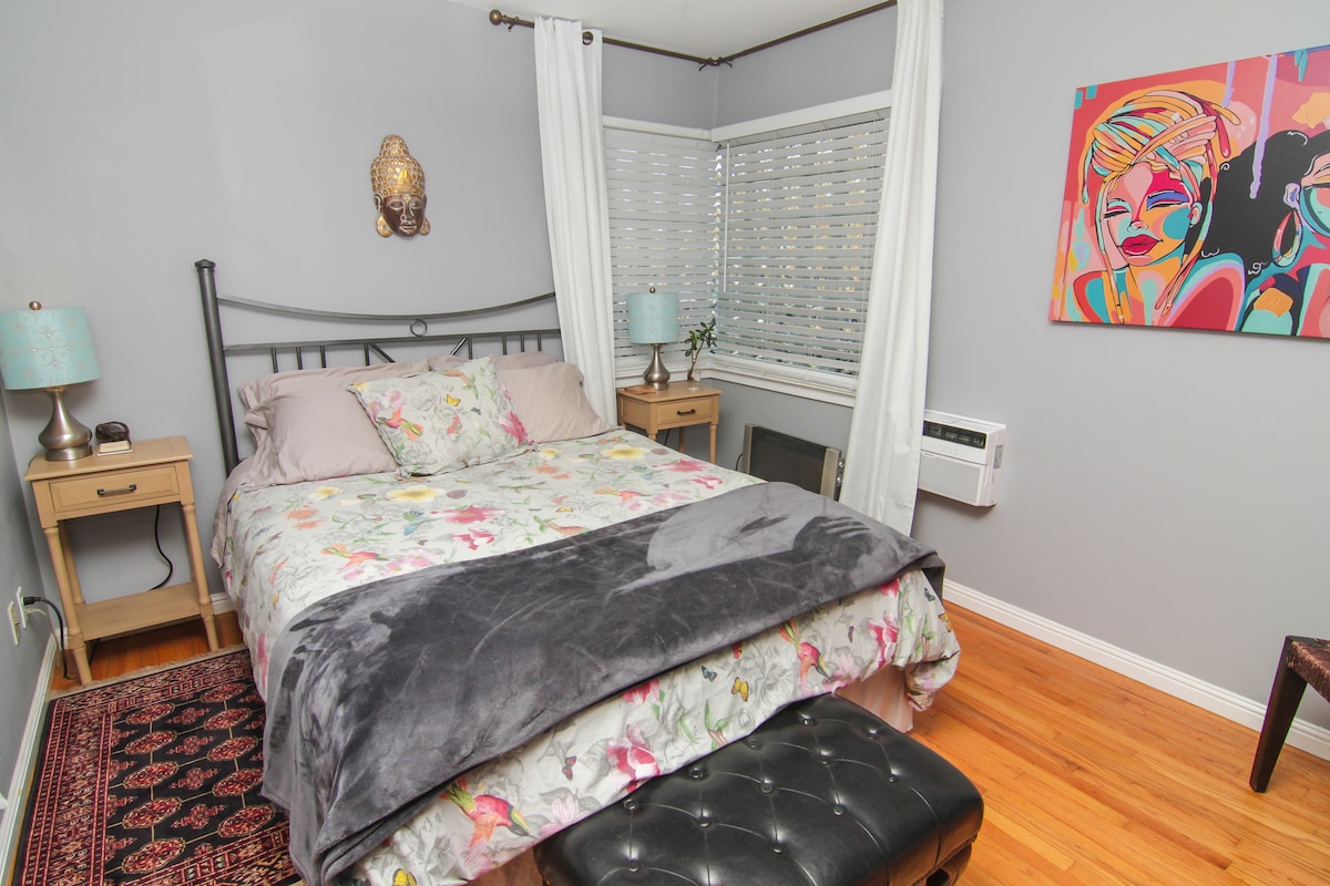 平均评分 5 分(满分 5 分),共 18 条评价都市绿洲中的迷人卧室,配备按摩浴缸