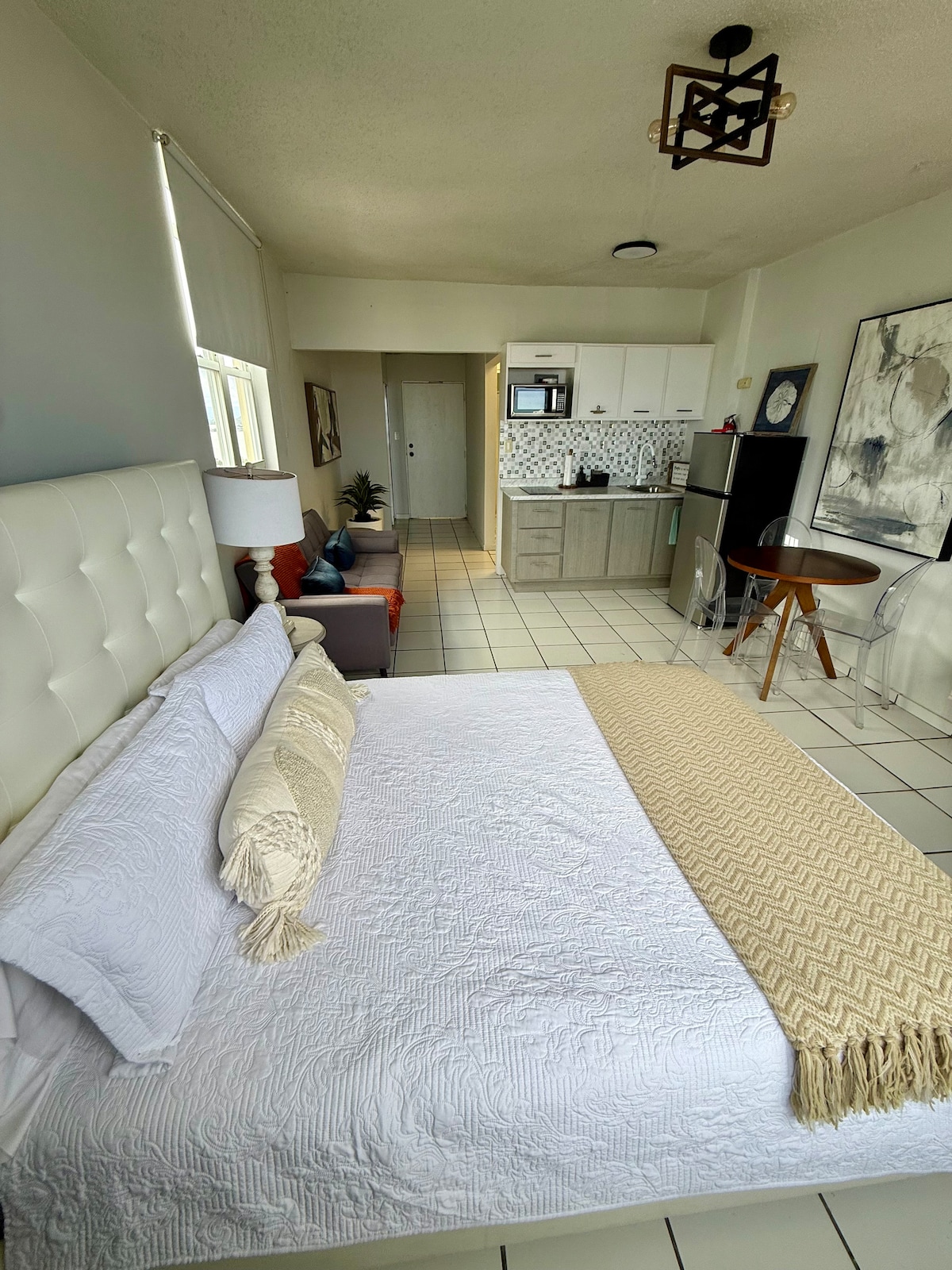 Unit 512, a stone's throw from Caribe Hilton and Old San Juan's entrance, offers a fusion of history and luxury. This king suite features a full bath, kitchenette, and laundry. Enjoy DirectTV on the Smart TV or work remotely at our desk. Explore Puerto Rico and relax in comfort at our perfectly situated condo.