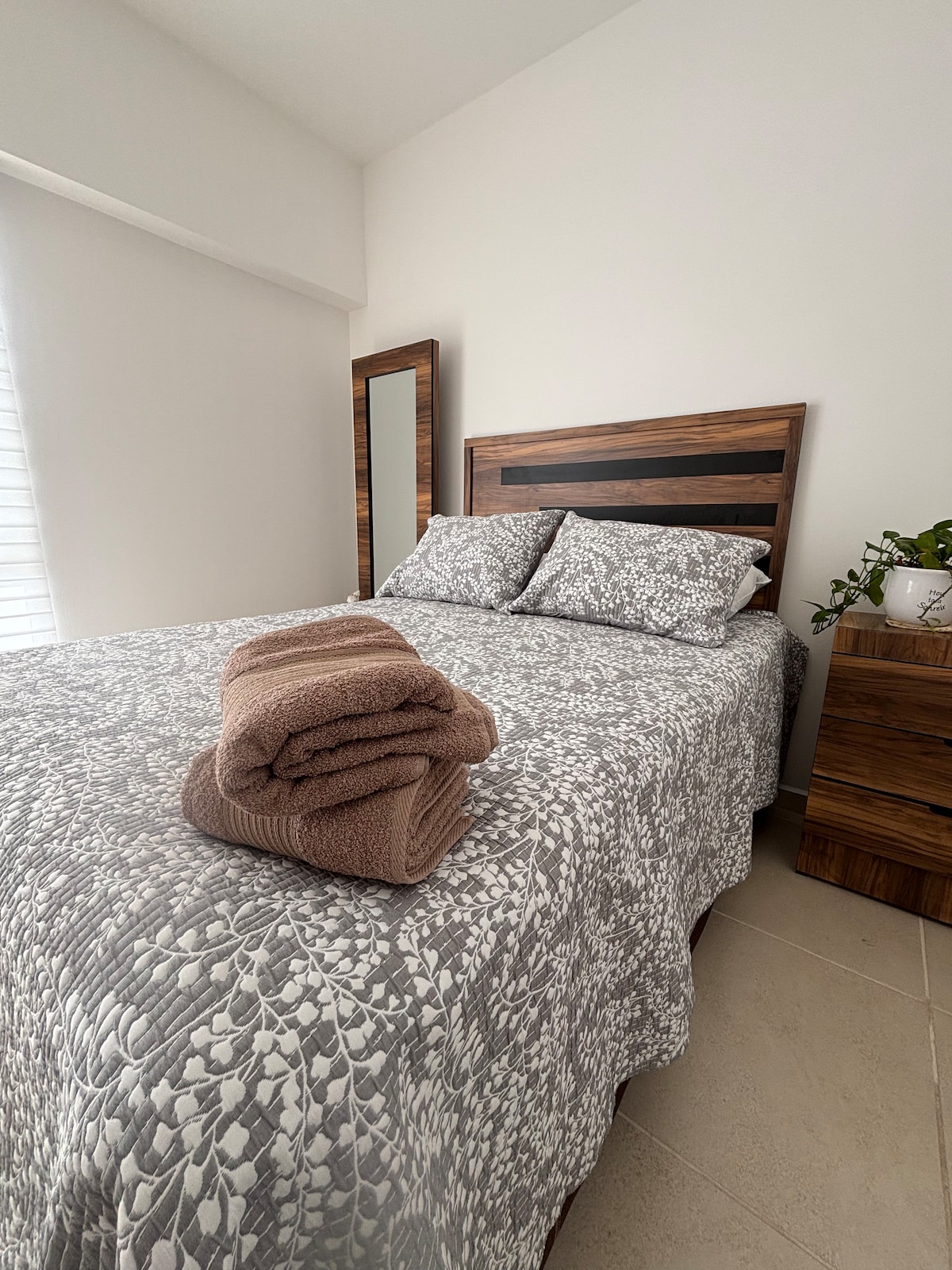 El departamento cuenta con aire acondicionado en RECÁMARA PRINCIPAL. El servicio se contrata por separado. Costo adicional de $99.00 pesos por día. Relájate en este espacio tan tranquilo y elegante. Totalmente nuevo con dos habitaciones. Espacioso para 4 huéspedes. Con opción para un 5to [con costo extra]. Con amenidades [gimnasio, ludoteca, espacio de trabajo, cine]. Excelente ubicación. En el sur de la ciudad. A 5 minutos de la plazas y supermercados. Haremos que tu estancia sea placentera.