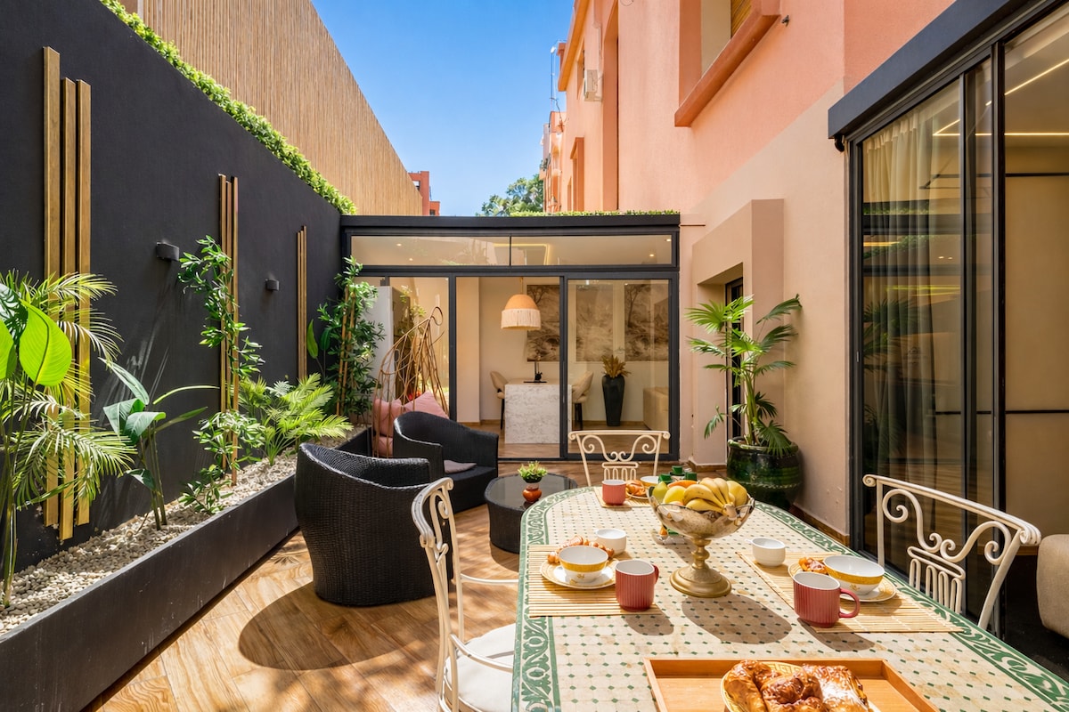 Séjournez dans ce magnifique appartement de 165 m², entièrement climatisé et chauffé, doté d’une très grande terrasse, d’un jacuzzi privé et d’une salle de jeux pour enfants. Idéalement situé en plein centre de Marrakech, il se trouve dans un immeuble avec ascenseur. À seulement 5 minutes du Carré Éden, vous bénéficiez d’un emplacement privilégié avec un accès rapide aux meilleurs restaurants, boutiques et attractions de la ville.