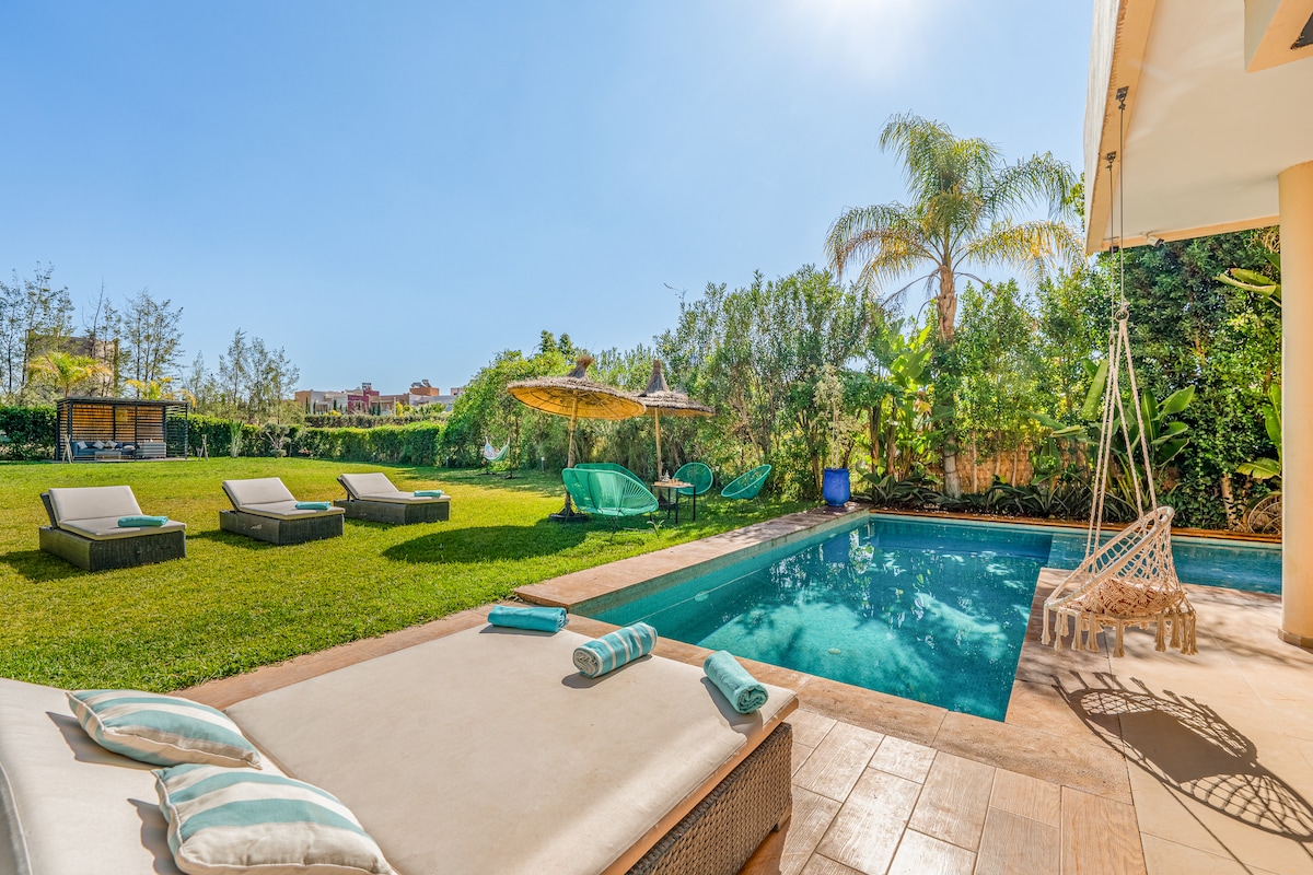 Luxury modern villa with Moroccan touch in Marrakech. For up to 8 guests, with 4 suites and private bathrooms. Living area with fireplace. Private cinema room with projector (Netflix), fibre Wi-Fi, billiard table(10 DH). Private pool with sun loungers and towels, terrace with free coffee. Hammam, spa (200 MAD), equipped kitchen. Private parking, secure residence. 3 min from Marjane, 12 min from Guéliz, 20 min from the airport.