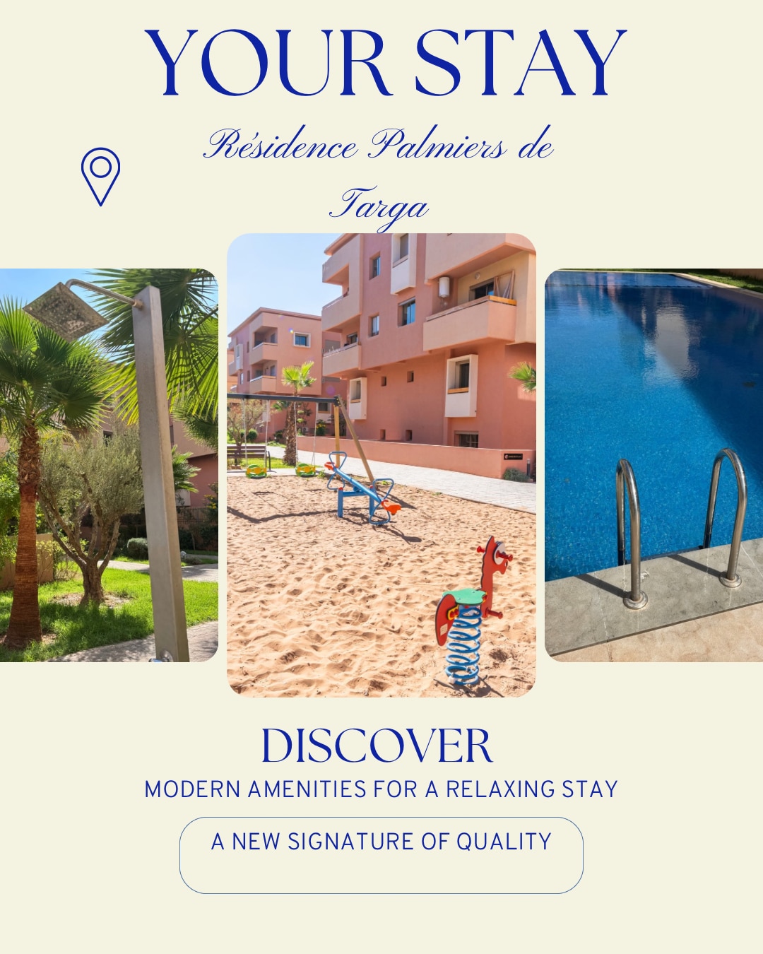 Enjoy a wonderful stay with the whole family in this stylish apartment. Located in the heart of the Red City, within a gated residence with secured access. The residence features green areas and a children’s playground, as well as 3 swimming pools throughout the complex. A private underground parking space is included, with direct elevator access to the apartment floor. The apartment is equipped with central air conditioning and also offers a swing with a pool view.