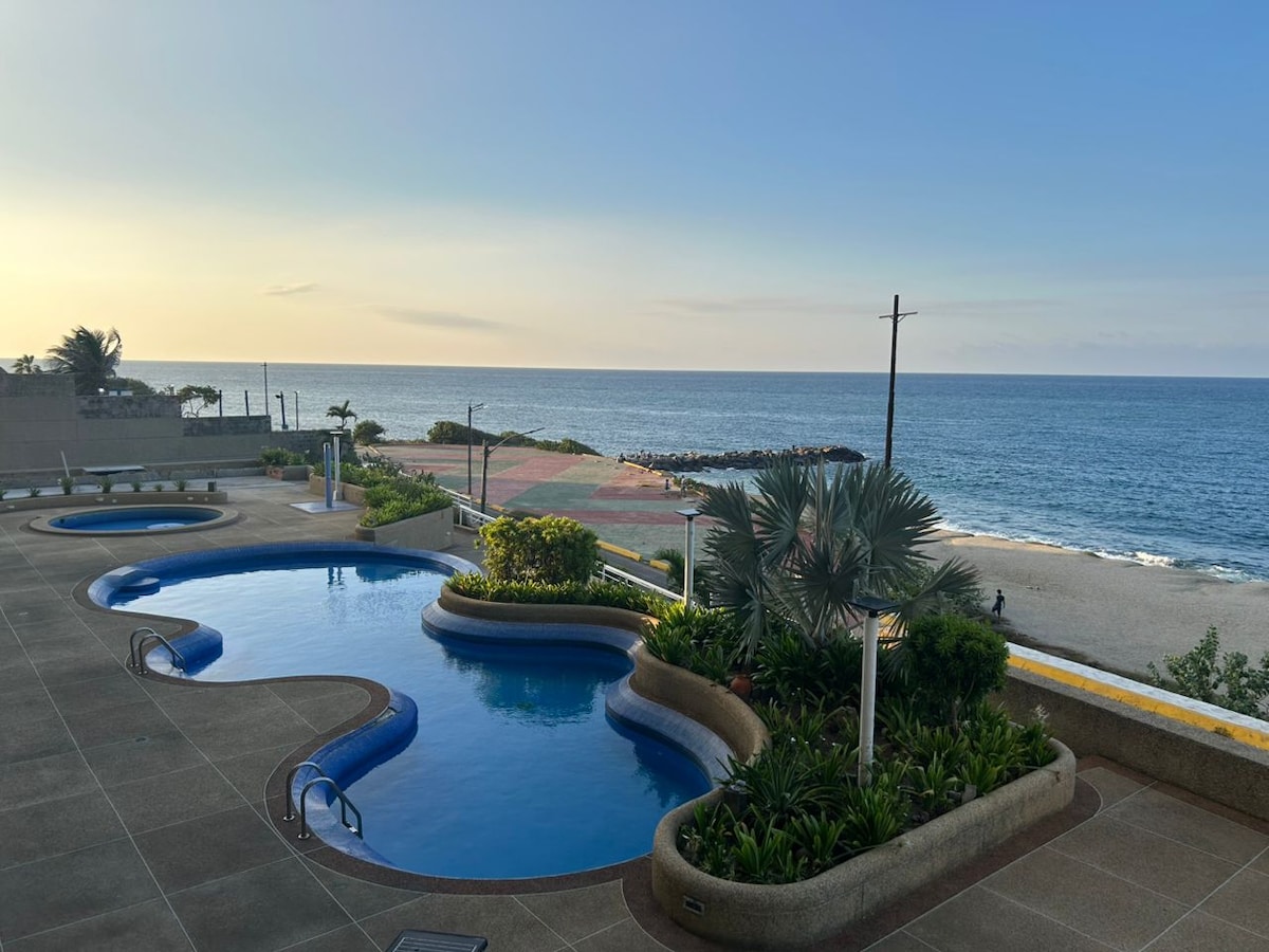 Frente al mar donde cada amanecer es una postal. A 30 minutos de Caracas y 10 minutos del aeropuerto de Maiquetia. Ven a relajarte y pasar unos días diferentes, en familia, con amigos o en pareja. Es igualmente perfecto para pernoctar después de un vuelo nocturno o antes de un vuelo matinal. Contamos con un hermoso balcón abierto, aires acondicionados, una cama Queen size, un sofá cama matrimonial, piscina, área de parrillas.