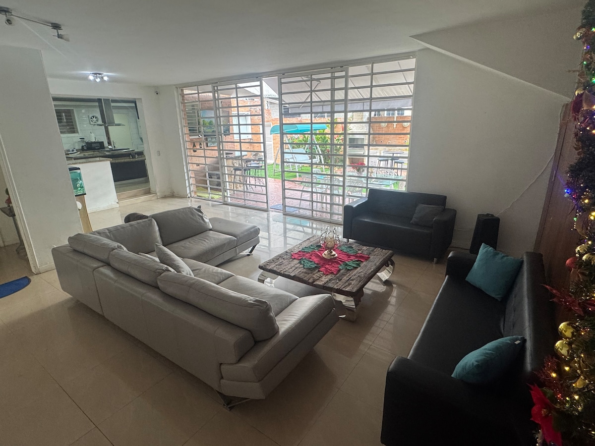 ¡Tu casa ideal con Jardín y parrillera! Capacidad para 6-8 huéspedes. Disfruta de 3 habitaciones (1 suite privada) y 5 baños totales. Comodidades: Cocina full equipada, internet de alta velocidad (Wi-Fi), y estacionamiento privado. El hermoso jardín es el centro de la casa. ¡importante! Un perro amigable y sociable vive aquí (ama a adultos y niños) Ubicación premium: Tranquilidad con acceso rápido a la ciudad. En la casa los eventos y reuniones sociales están permitidos; las fiestas NO