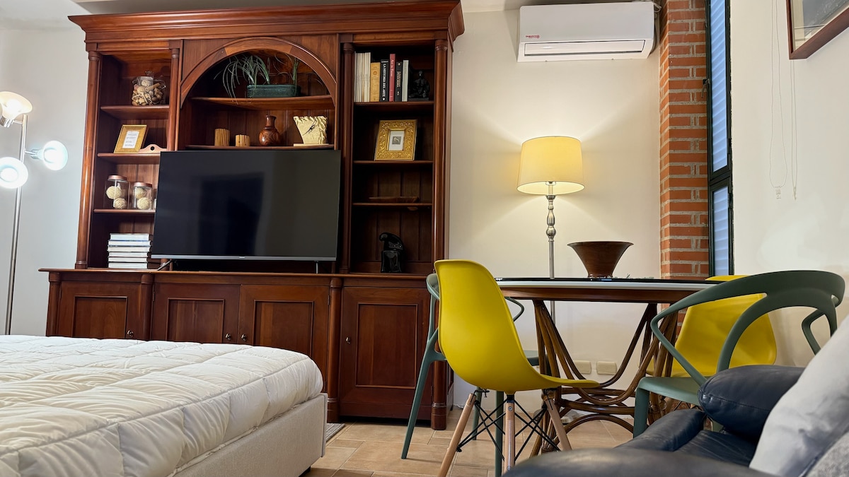 Ideal para familia o grupo, el espacio se divide en área social con cómoda cama matrimonial y baño y una habitación contigua independiente con cama Queen y baño privado con vestidor walk-in closet, y su aire acondicionado split. El apartamento tiene cocina de 4 hornillas, microondas, nevera completa. Escritorio con wi/fi. vista a lasmontañas desde la hab/y amplio jardín vistable abajo en área de otros anexos, con parrillera portátil de carbón.