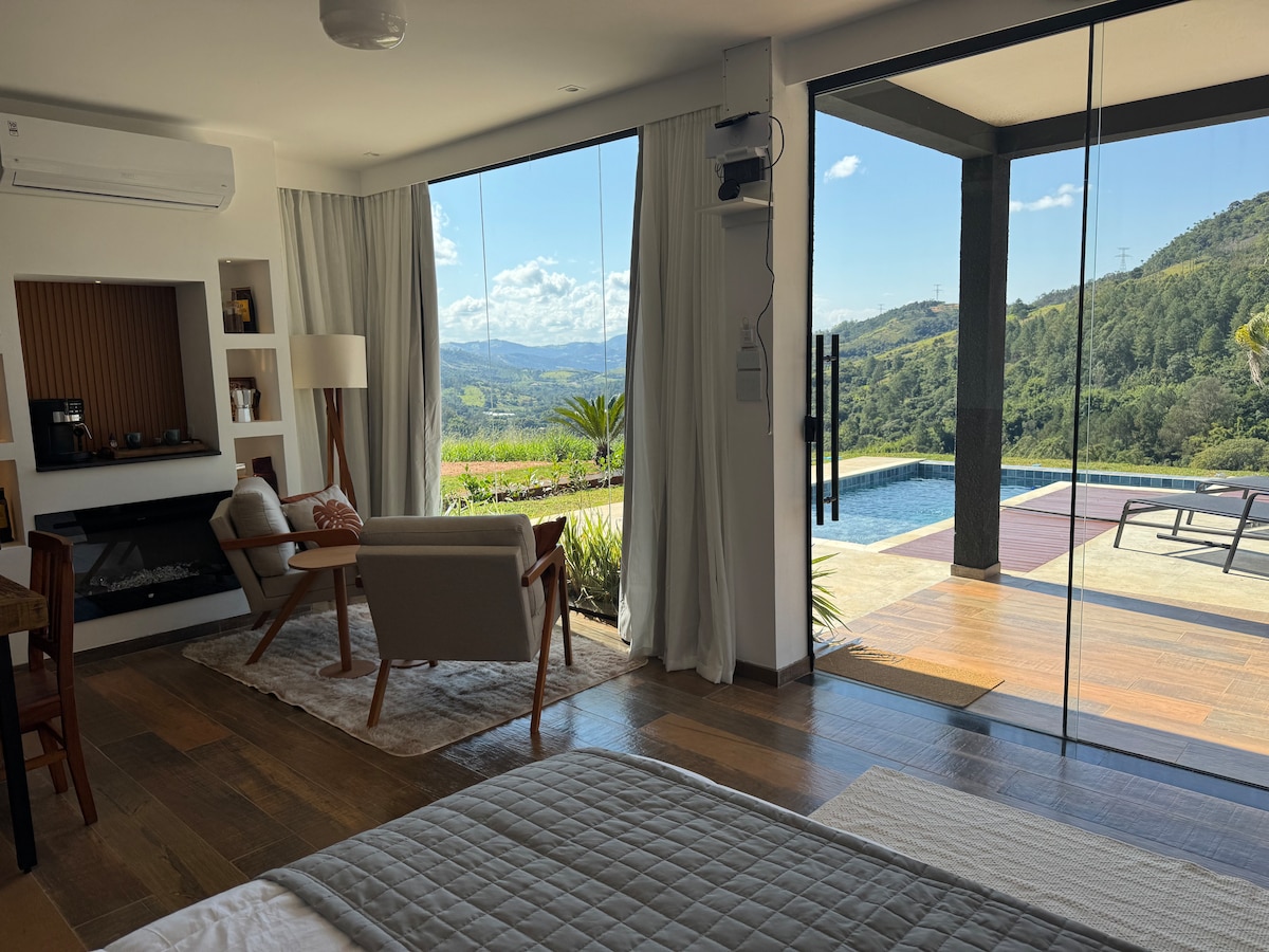 DESCONECTE - SE e venha viver esse sonho! Chalé com privacidade, internet de qualidade, Tv com Netflix, ar condicionado quente e frio, Lareira interna ecológica, banheira de hidromassagem com cromoterapia, uma cozinha completa. A melhor parte! na natureza, próximo a mata, possível escutar o som da cachoeira, com uma vista impressionante do por do sol e um deck maravilhoso com lareira a lenha pra apreciar a noite com um bom vinho !