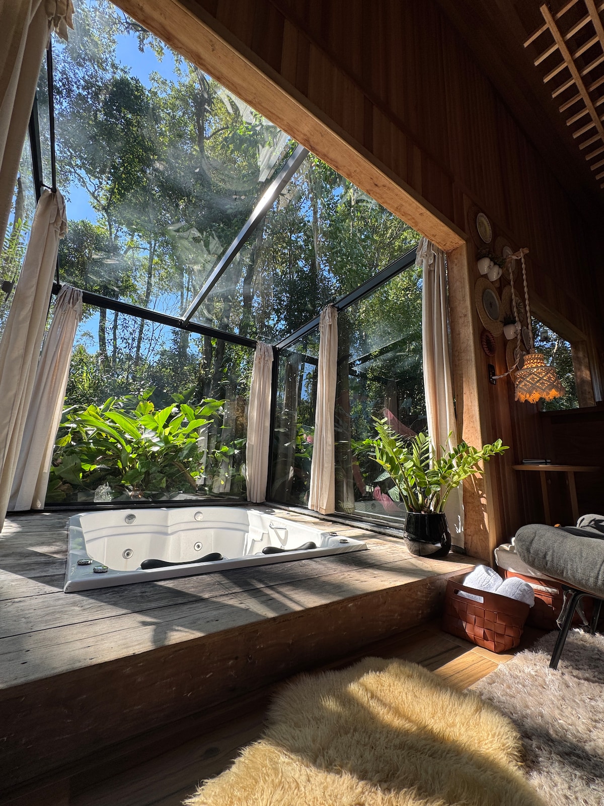 Próximo a SERRA DO RIO DO RASTRO. A cabana tem vista “verde” para todos os lados. A banheira está sob a copa das árvores e totalmente integrada com a natureza, é como estar na mata, porém com o conforto e segurança de estar dentro de casa. O local é bem reservado e silencioso, a não ser pelo cantas dos pássaros. Em dias de chuva o teto de vidro aproxima o contato e a sensação de relaxamento. Possui água quente em todas as torneiras com aquecimento a gás.