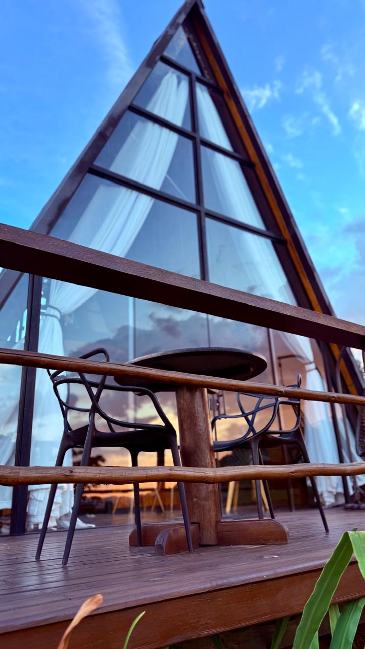 Refúgio romântico em meio à natureza, ideal para casais. Chalé estilo suíço (A-frame) em sítio cercado por cafezais, com rio e cachoeira particulares. Possui banheiras externas com vista para a Serra da Mantiqueira, jacuzzi interna, fogueira, churrasqueira, quadra de beach tênis, cama-balanço, sauna seca com vista e projetor interno com telão de 100”.