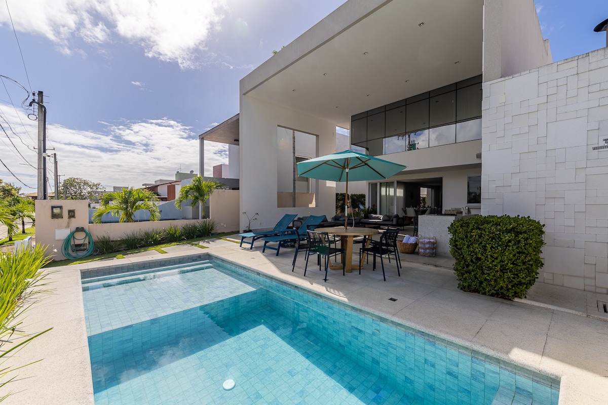 Esta luxuosa casa, situada em um condomínio fechado beira-mar, oferece conforto, luxo e estilo. Aproveite o espaço integrado, cozinha gourmet, piscina aquecida e área para refeições ao ar livre. Com 05 quartos, sendo 04 suítes, 01 home e 01 dependência completa, é perfeita para grupos maiores ou famílias. Divirta-se com o PlayStation 5 e relaxe na piscina aquecida. Também disponibilizamos carregador portátil de carro elétrico.